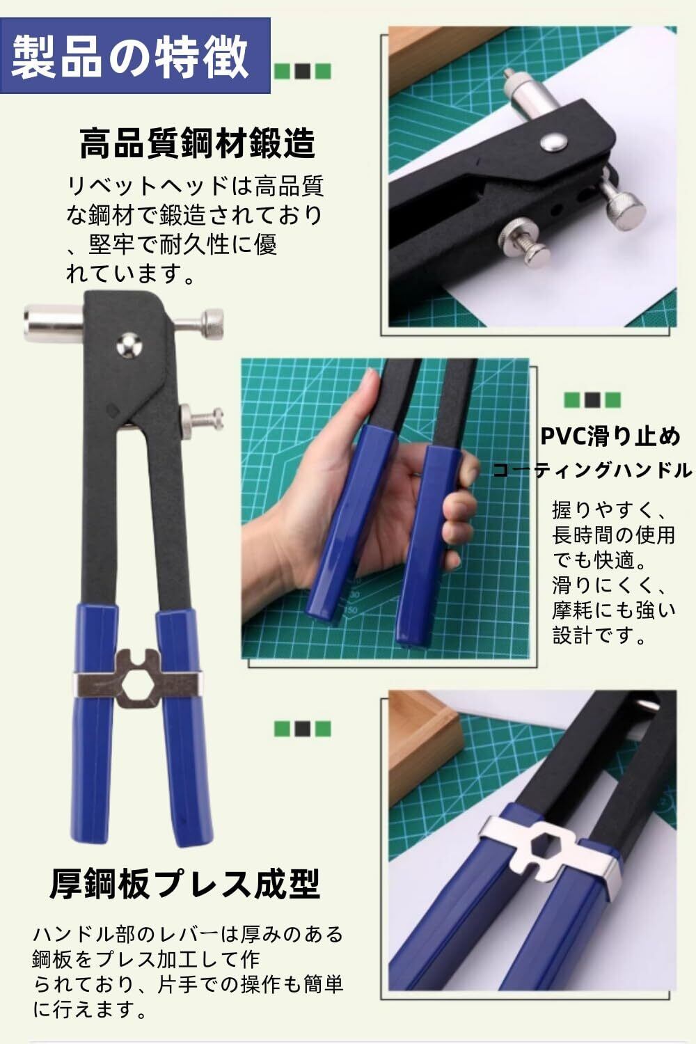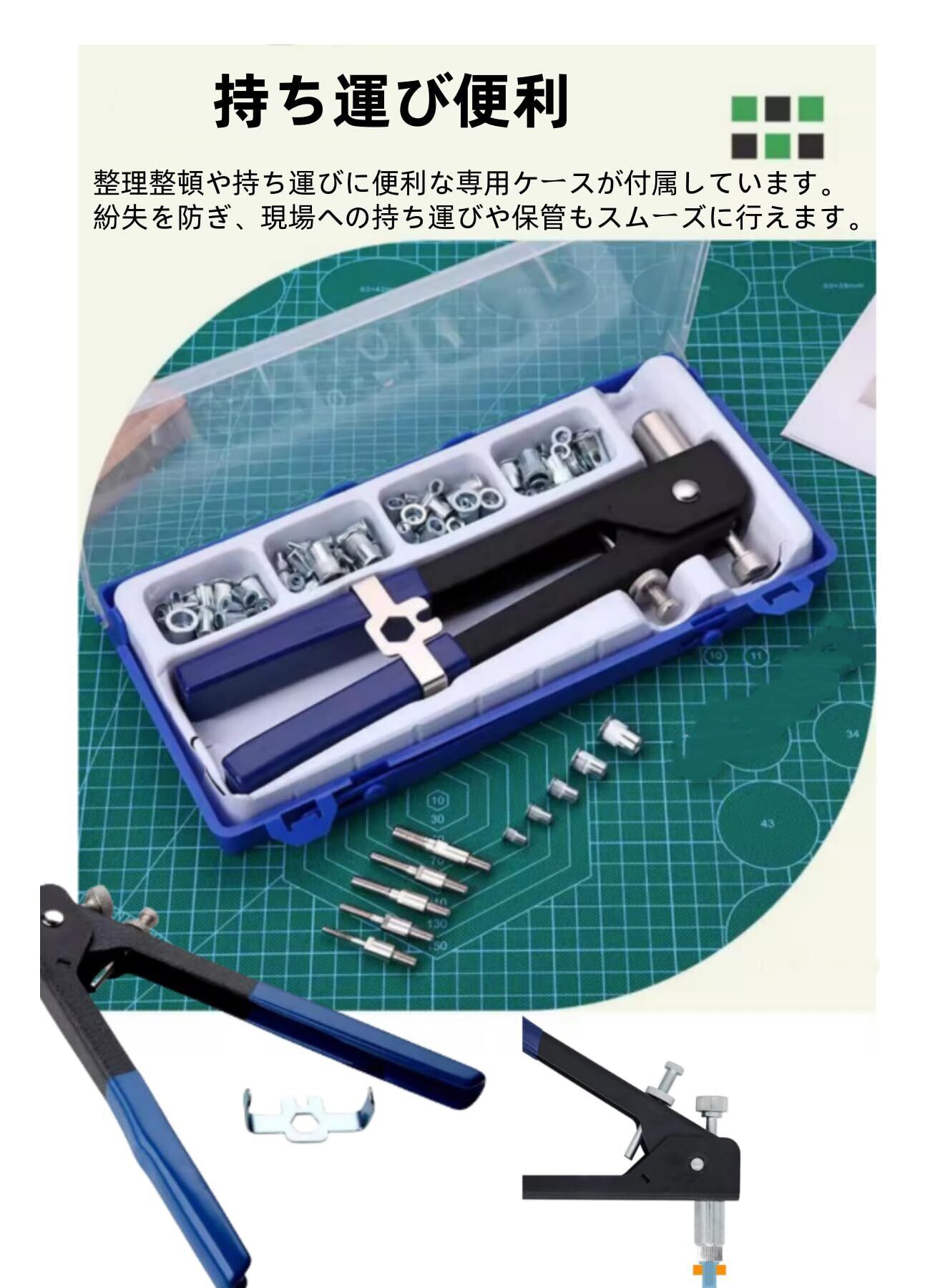 【便利な設計で作業効率UP】芯棒式で、ナットの取り外しが簡単。レバーは開口を制限し、ねじの変形を防止。付属のリベットナットは滑り止め構造で、しっかり固定できます。