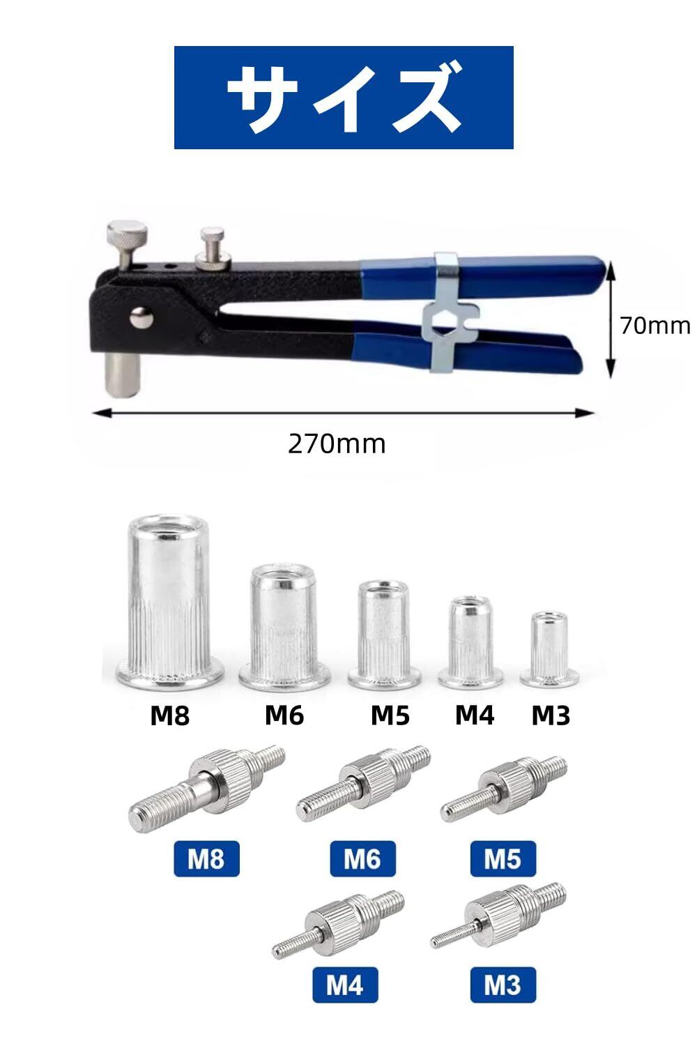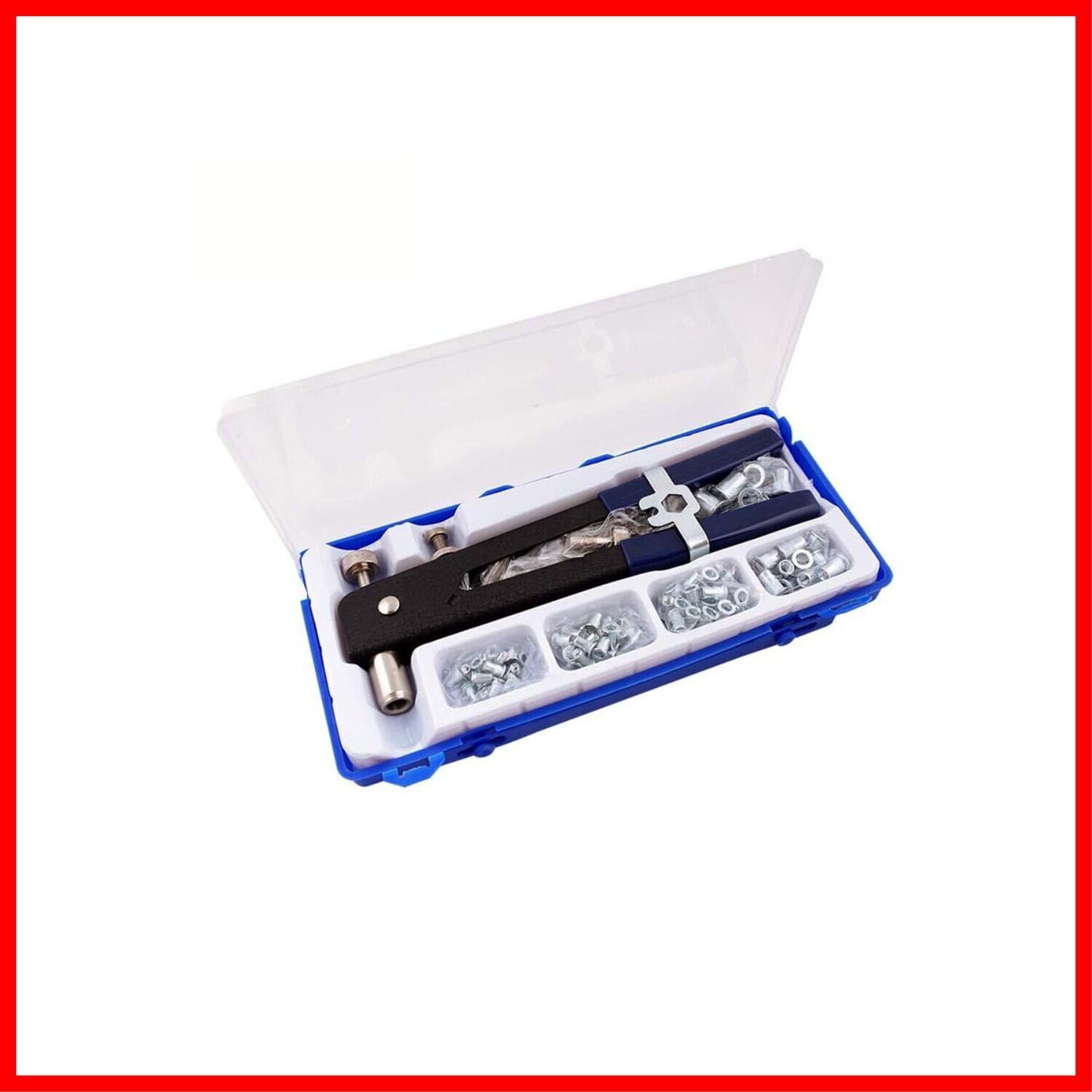 【セット内容】ハンドリベッター×1、交換用心軸×5(M3/M4/M5/M6/M8)、リベットナット×105個(M3/M4/M5 各25個、M6/M8 各15個 )をセット。