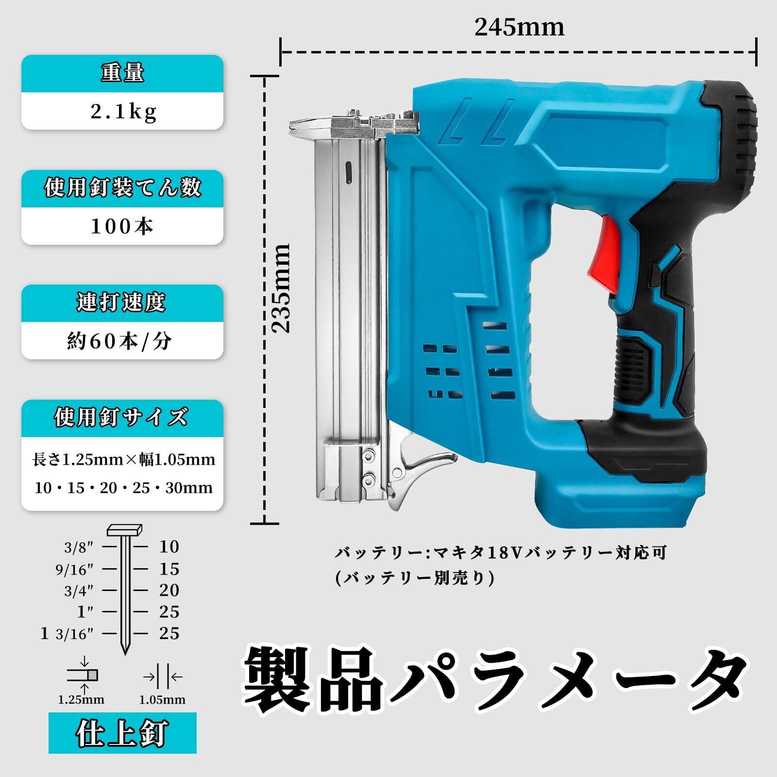 【製品詳細】本体サイズ(約):24.5×23.5×7cm。本体重量(約):2.1kg。定格電圧:18v。使用釘装填数:100本。連打速度:60本/分。適用釘サイズ:1.25㎜×1.05㎜×10・15・20・25・30㎜。パッケージ内容:本体、お試し用釘500本。※バッテリーと充電器が含まれておりません。