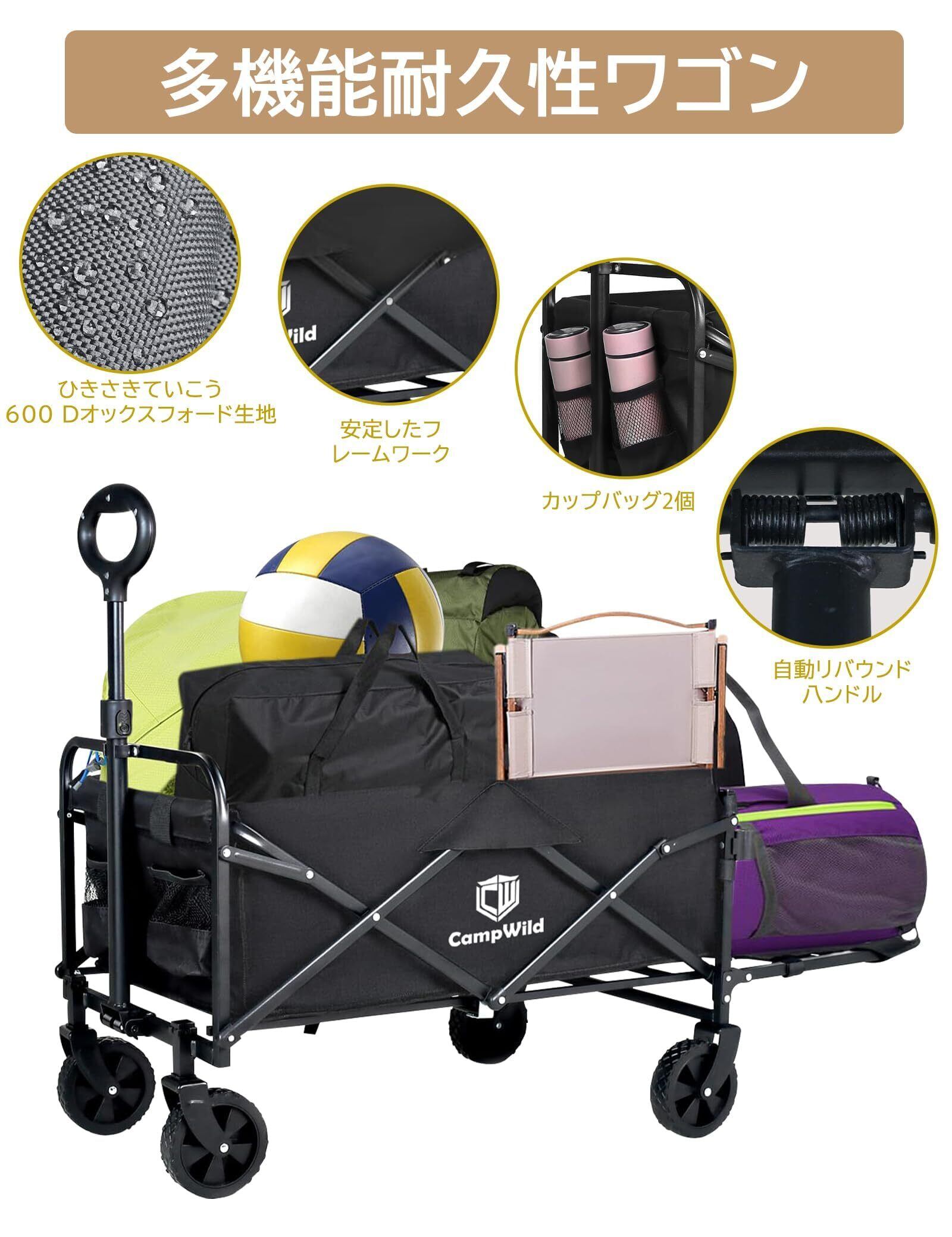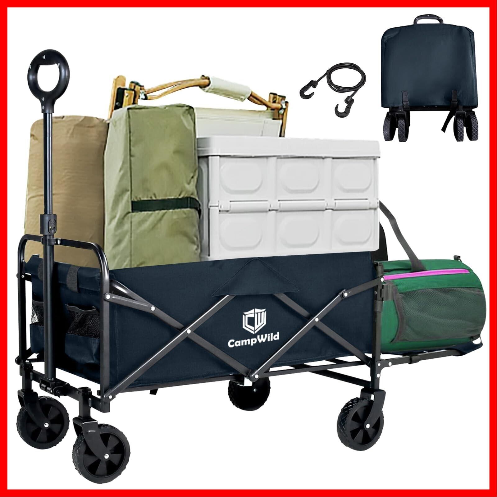 CampWild キャリーワゴン キャリーカート アウトドアワゴン 後部展開可 長物対応 折り畳み 超軽量5.3kg 大容量130L 耐荷重120kg ワンタッチ収束式 キャンプカート 自立収納 多地形対応 砂浜 釣り 引越し 買い物 ゴミ出し (ブルー)