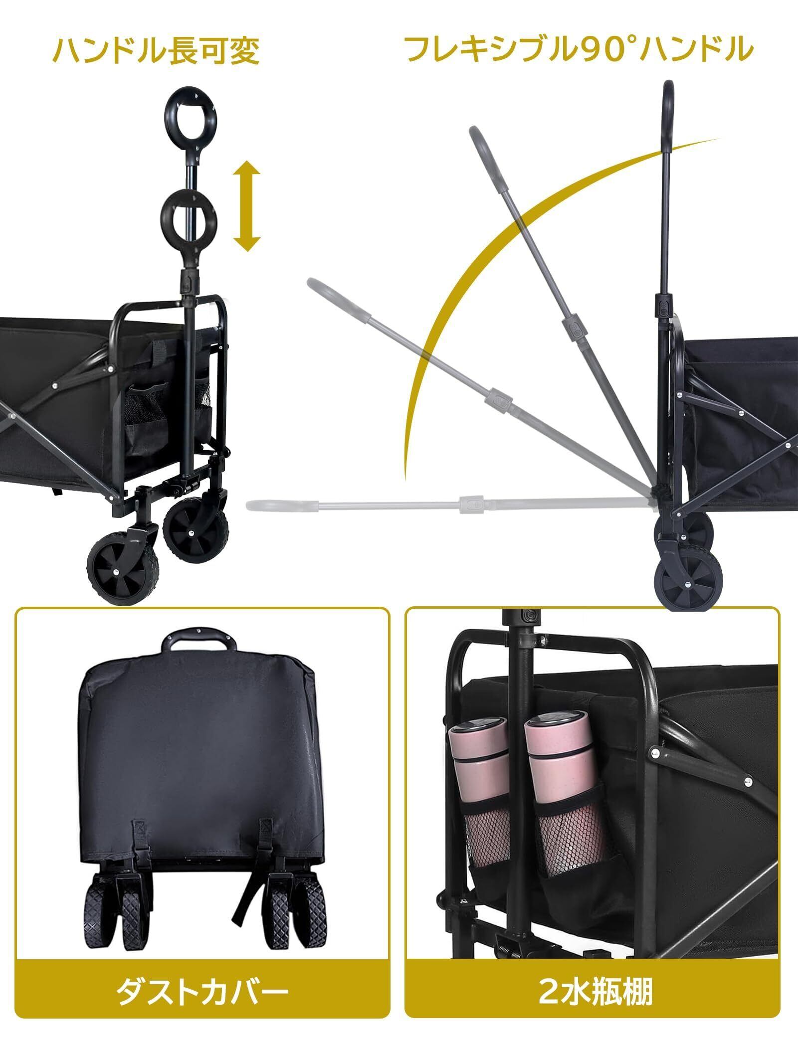 【大容量&高耐荷重で安心して使用】:130Lの大容量を備え、アウトドア用品や食品、その他の必需品を持ち運ぶのに便利です。展開時サイズは奥行き75cm、幅45cm、ハンドル高さ65~88cm、テールゲート展開時奥行さ100cm、折り畳み時は奥行き45cm、幅15cm、高さ65cmとコンパクトで省スペース。キャンプや家族でのピクニックなど、アウトドア活動の携帯ニーズに応える実用的なアイテムです。