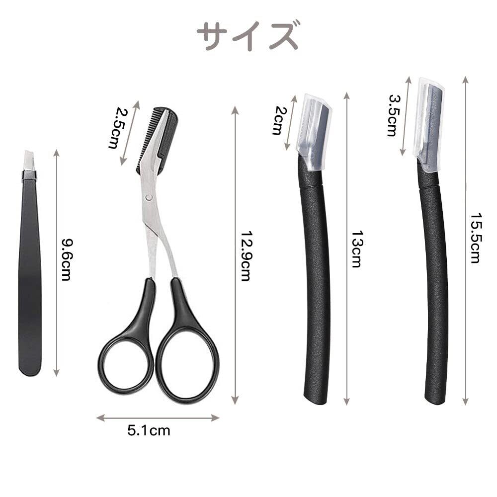 セット内容:毛抜き、コーム付きまゆげ用ハサミ、ガード付きカミソリ(小)、ガード付きカミソリ(大)、まゆ毛用テンプレート(10種類)、収納袋付き。