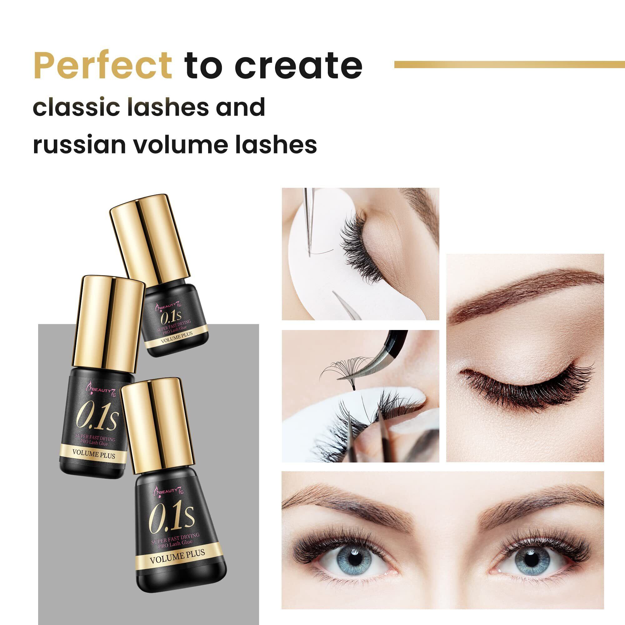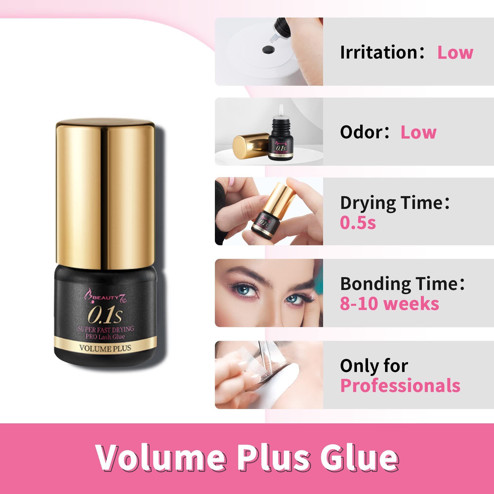 【高速硬化】Beauty7 Volume Plusグルーの硬化時間はわずか0.1秒、プロに向けて、より迅速かつ効率的にサービスをご提供いただけます。ご注意:セルフまつげエクステには禁止です。グルーを使用するの時にも目や根元の皮膚が接触させないでください。