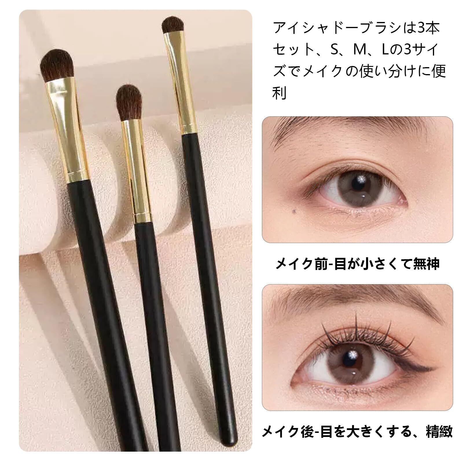 【アイシャドーブラシ】アイシャドーブラシはブレンドと塗布が簡単で、に涙袋の線を描くのとまぶたに使用できます、均一なカバレッジと正確な塗布が可能です。アイシャドーブラシは3本セット、S、M、Lの3サイズでメイクの使い分けに便利。