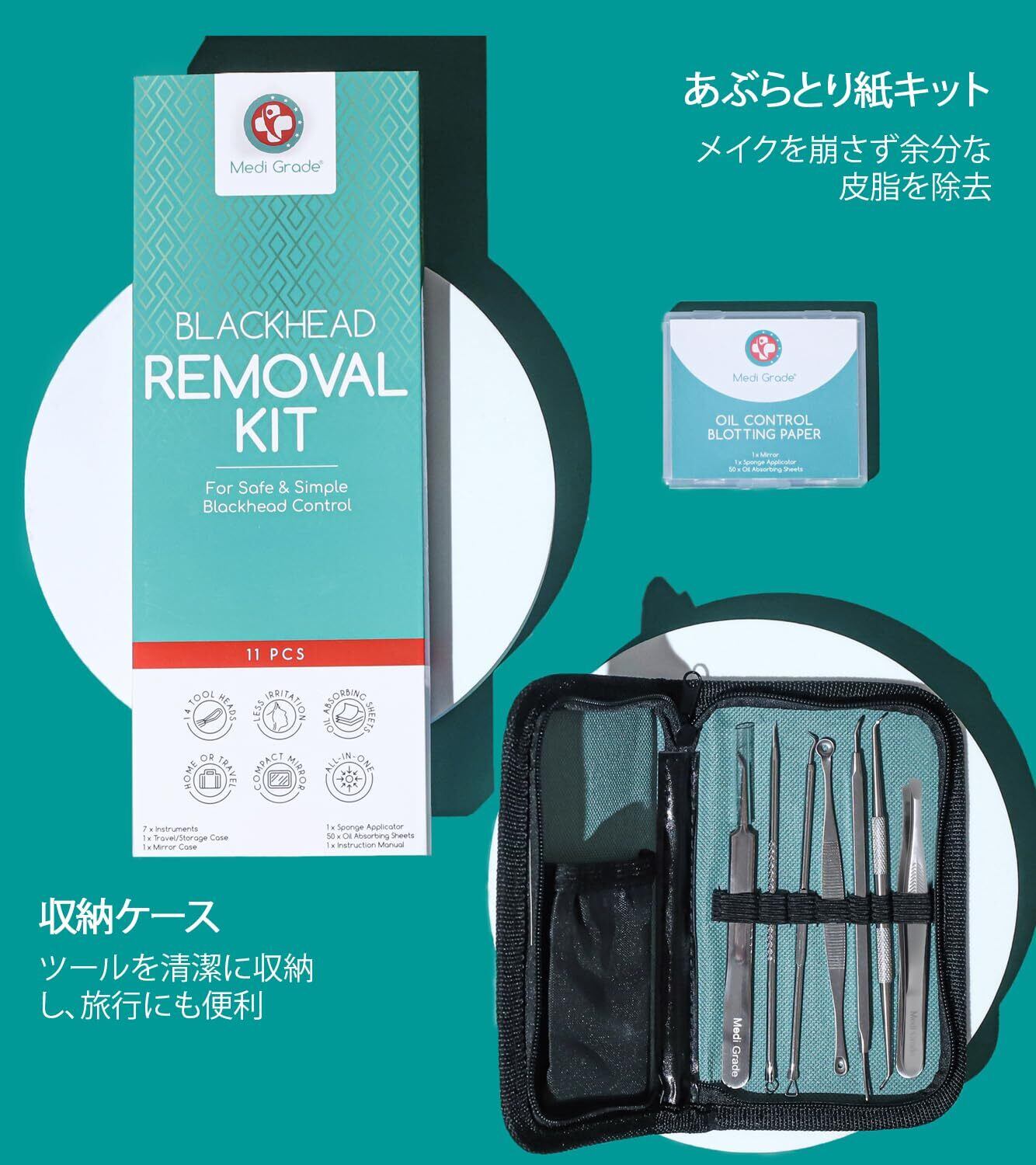 Medi Grade ブラックヘッド除去ツール - 毛穴ケアと肌のお手入れ用7点セット - 50枚の油吸収あぶら取り紙付き - 黒ずみが気になる方のスキンケアキット