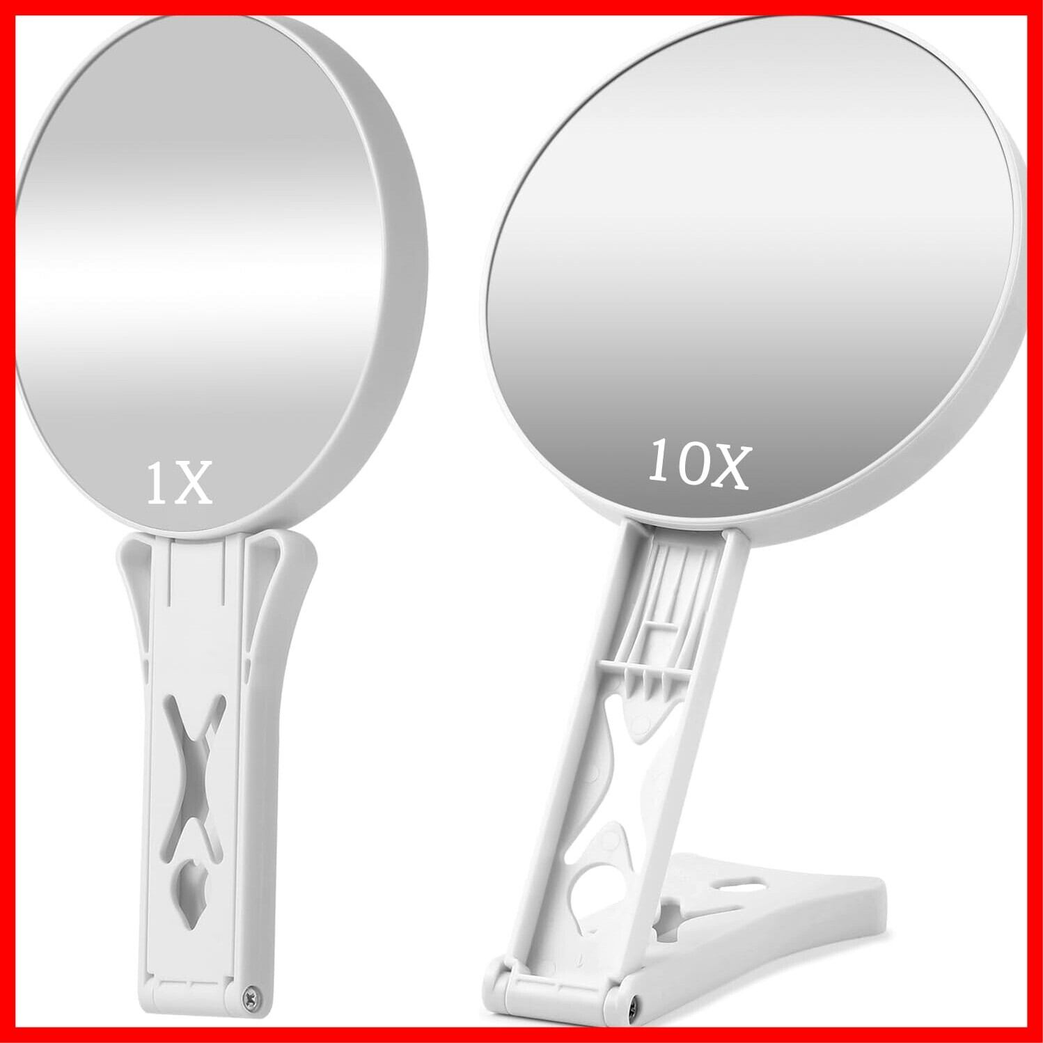 手鏡 拡大鏡 メイク 10倍と等倍両面化粧鏡 折りたたみ 卓上ミラー&ハンドミラー 吊り下げ式 ハンドル取外し可能 コンパクト 軽量 持ち運び便利 円形 14CM クリア (ホワイト-10X)