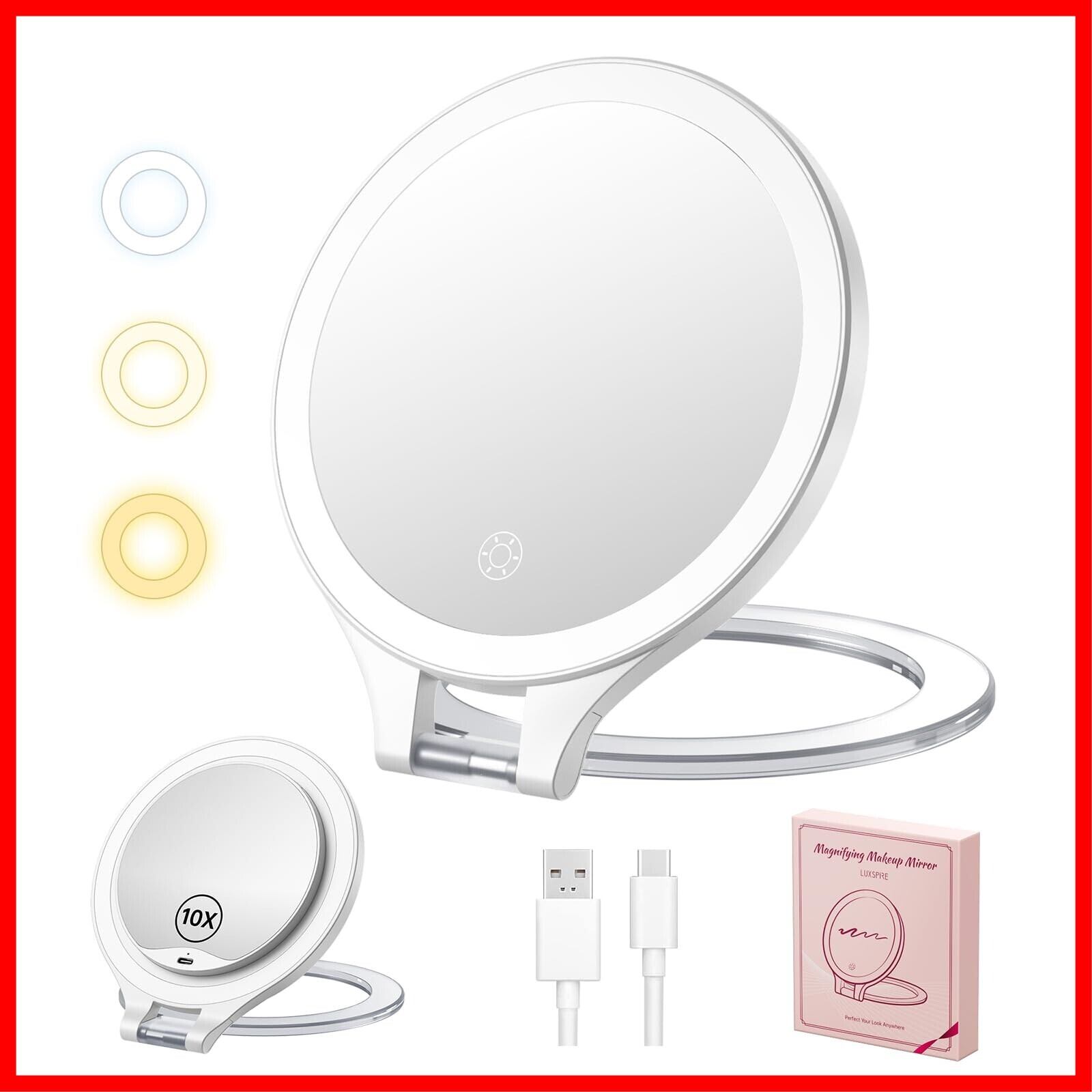 LEDライト付きミラー Luxspire LEDライト鏡 化粧鏡 手鏡タイプ 女優ミラー 折り畳み 卓上 壁掛け ハリウッドミラー メイク鏡 携行 省スペース 角度調節可能 拡大機能付き 3種類の色温度 輝度無段階調節 タッチ式 USB充電 10倍拡大 収納便利 日本語取扱説明書 ホワイト