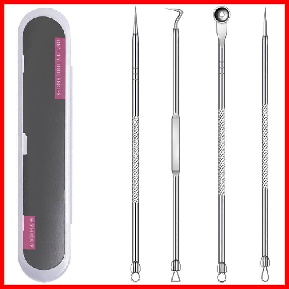 にきび針セット 4点セット 毛穴ケア専用キット ニキビ取り 黒ずみ取り 角栓プッシャー 抗菌ステンレス 美容ツール 収納ケース付き 携帯便利 (シルバー)
