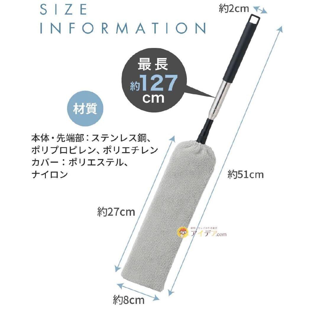 最短51cmから最長127cmまで、用途に合わせて、縮めて、伸ばせる。伸縮可能だから腰を曲げずにラクラクお掃除