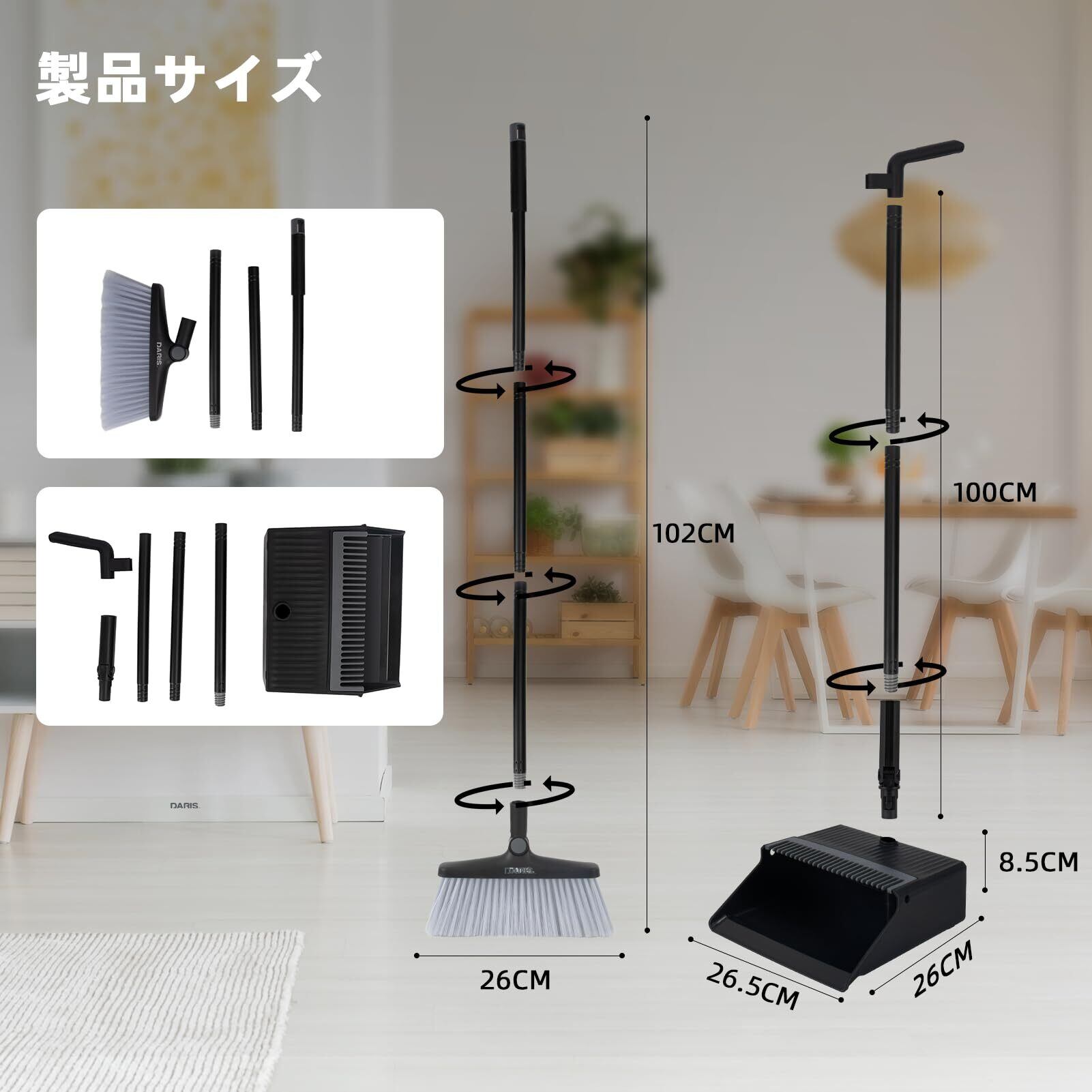【楽に掃除】:ほうきは53.5㎝~102㎝までの長さを調整することができます。腰を曲げず、楽に掃除できます。くしが付いので、手を汚さずにほうきに付いた髪の毛をきれいに落とします。