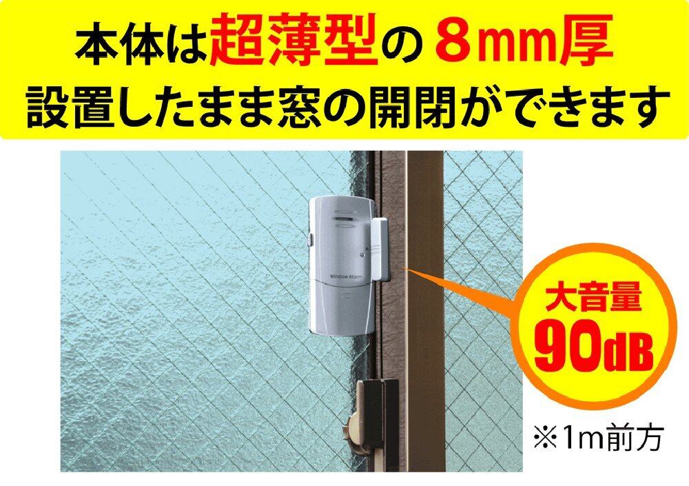 ●窓の開閉と振動を感知する、2‐way防犯アラーム。本体は超薄型の8mm厚。設置したまま窓の開閉ができます。窓からの侵入を防ぎ生命と財産を守る。テープを剥がして貼るだけの簡単設置