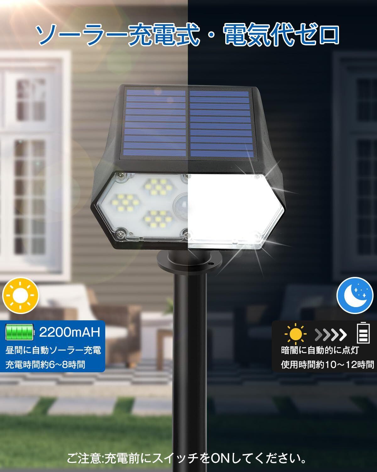 【22%転换率・2200mAh大容量】当社のソーラースポットライトは、高効率の単結晶シリコン技術を採用しており、配線と給電不要です!ソーラーバネルの面積より大きく設計により、エネルギー変換効率が向上するだけで転换率は22%に達します。2200mAh大容量バッテリーで、照明持続時間は大幅に向上しました!昼間に自動ソーラー充電時間約6~8時間、暗闇に自動的に点灯の使用時間約10~12時間になります。【ご注意:充電前にスイッチをONしてください。】