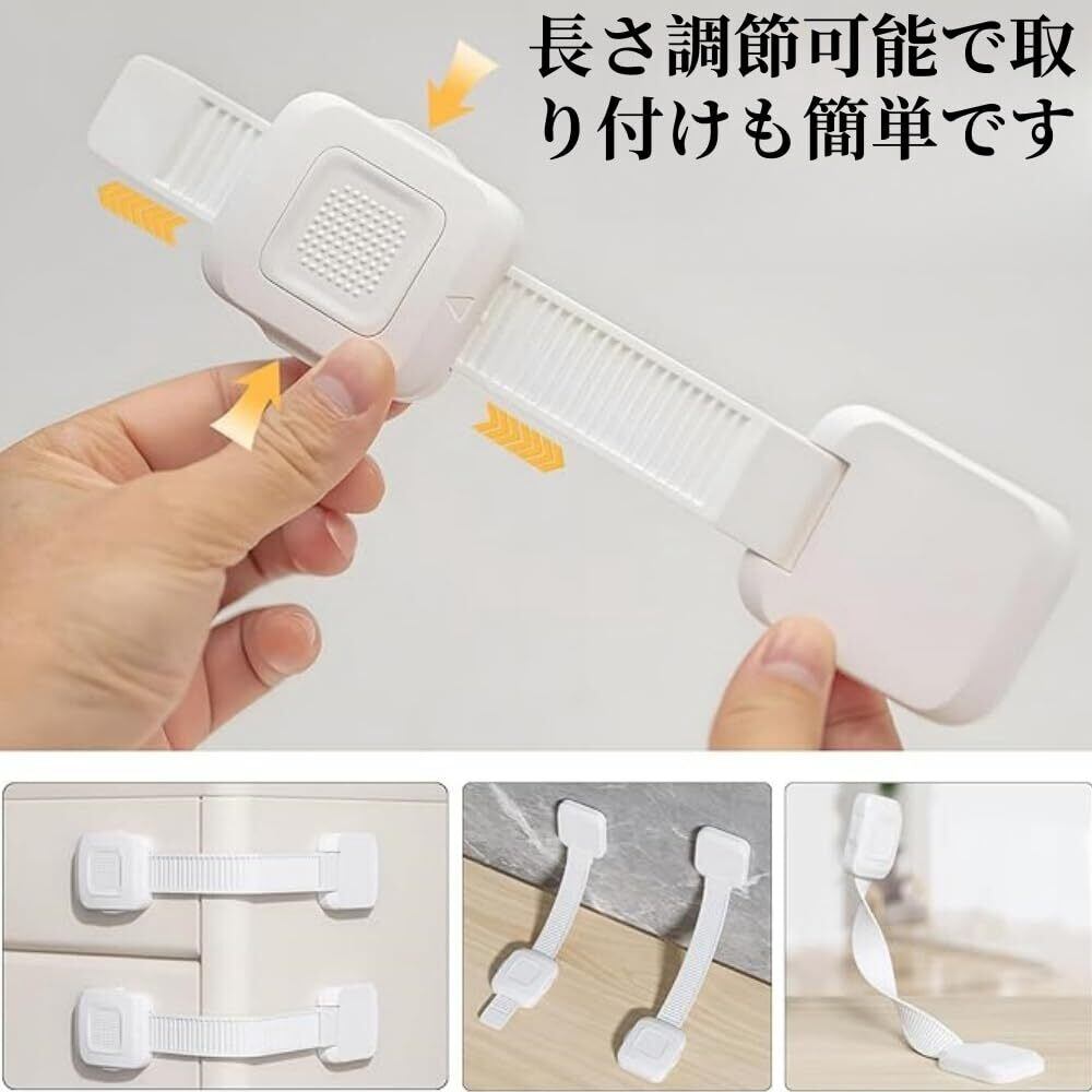 特徴です:br > 1.転倒防止ストッパー長さ調整ができるため、取り付ける対象や場所に幅広く対応できるのが特徴です。br > 2.天面でも側面でも設置することができます。耐震ストッパーが家具の大きさに合わせて複数設置することで耐震を強化することができます。br > 3.転倒防止ストッパーはお好みの箇所に強力な両面透明テープで貼り付けるだけ家具に傷つけません。br > スペックです:br > 材質:ABCエコ素材ですbr > 色:白ですbr > セット内容:多機能セキュリティロックです *2br > 備考ですbr > 手動測定により、サイズと重量に一定の誤差がある場合があります。