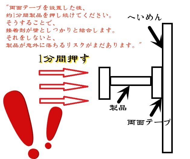 [注意事項] 両面テープを使用する際は、両面テープが空気中に露出する時間をできるだけ減らし、ほこりが両面テープの吸着力に影響を与えないようにしてください。取り付け後、付属の両面テープが付いたベースを1分間押し付けることで、両面テープが表面と十分に接触することができ、両面テープの吸着力低下のリスクを大幅に減らすことができます。 伸縮棒が過度に伸ばされると、軽微な揺れが生じる場合がありますが、取り付けが成功すると、製品の性能に問題が発生することはありませんので、揺れについて心配する必要はありません