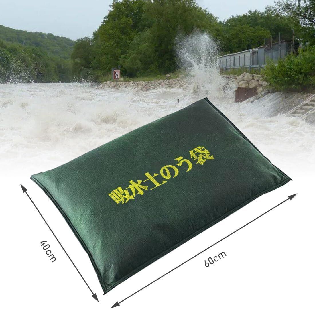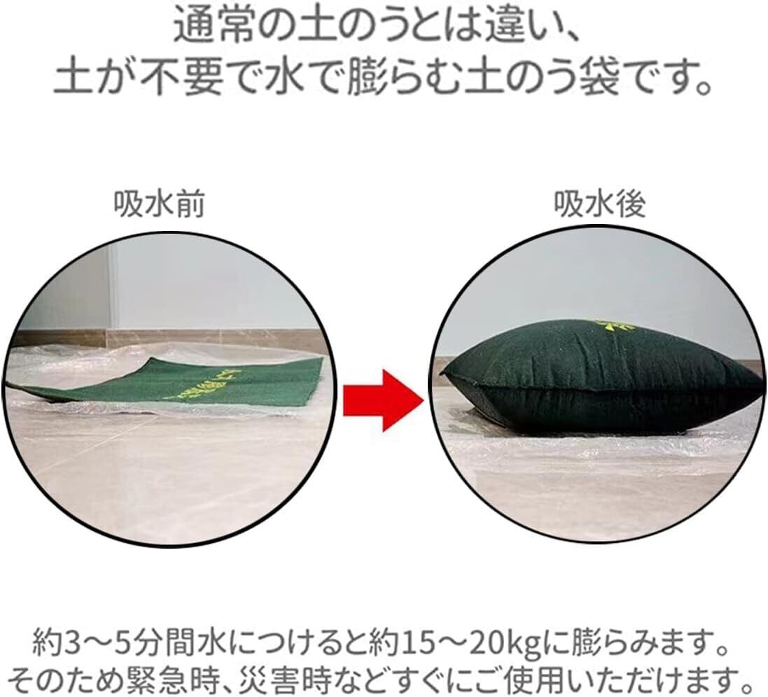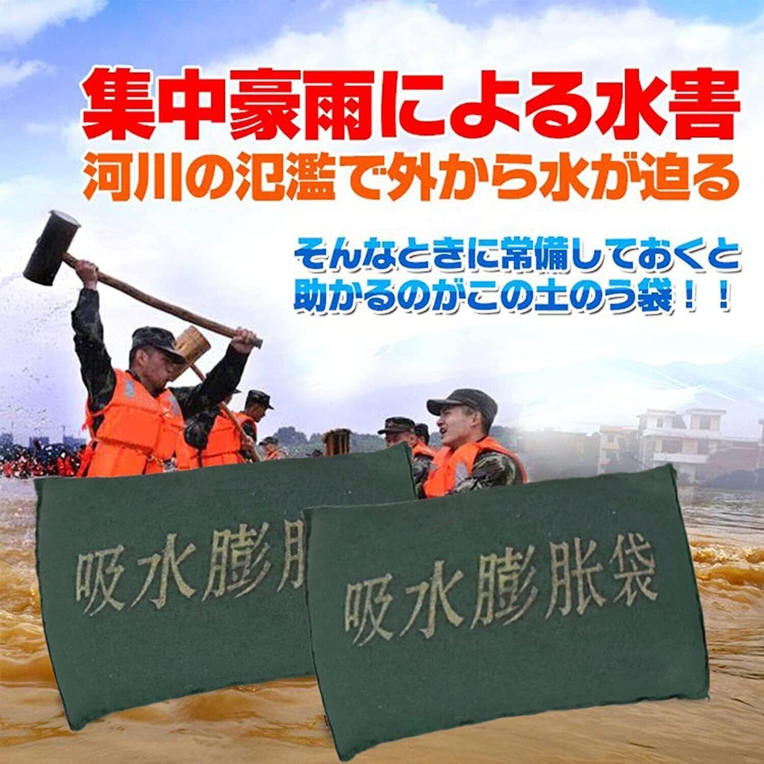 【セット内容】吸水 土嚢袋×10枚セット。 【土砂不要・水で膨らむ】吸水土嚢袋は非常用簡易吸収土嚢には土がなく、水で膨らむだけです。抜群の吸水性 ラフな外観だが、機能性を重視することでコストダウンを実現。都市型水害の初期防水防災に! 【サイズ・耐久性素材】サイズ:40cm×60cm(吸水前1枚あたり)重量(約):吸水前-280g、吸水後-15kg~20kg(3分~5分浸水目安)。繊細な縫製ステッチは壊れにくく、安全に使用できます。内蔵の吸水性樹脂が水を保持し、強い耐圧性を持っています。 【再利用可能・耐候性】どのう袋 防災バッグの外袋は麻繊維で滑りにくく、かつ環境に優しい素材を使用。ポリマーは高吸水性ポリマーで無公害。再利用OK!使用後は元の大きさに戻すことができないが、風通しのよい場所で自然乾燥させると、また再利用も可能です!後処理も簡単です。 【用途】浸水害・鉄砲水・ゲリラ豪雨対策として水だけで簡単に膨らみ土のうとしてお使い頂けます。また、濁流を被害なく迂回させる為の水路誘導としてお使い頂けます。