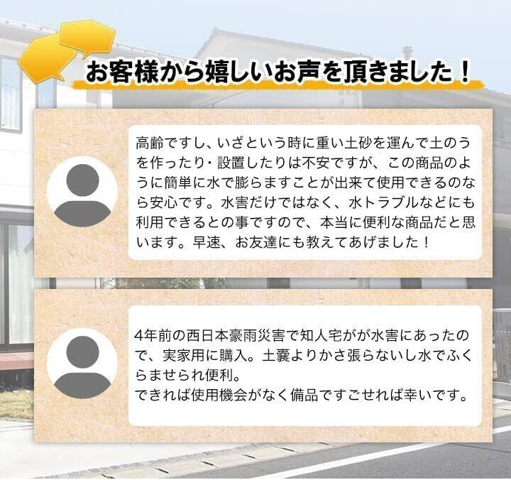 【土砂不要・水で膨らむ】吸水土嚢袋は非常用簡易吸収土嚢には土がなく、水で膨らむだけです。抜群の吸水性 ラフな外観だが、機能性を重視することでコストダウンを実現。都市型水害の初期防水防災に!