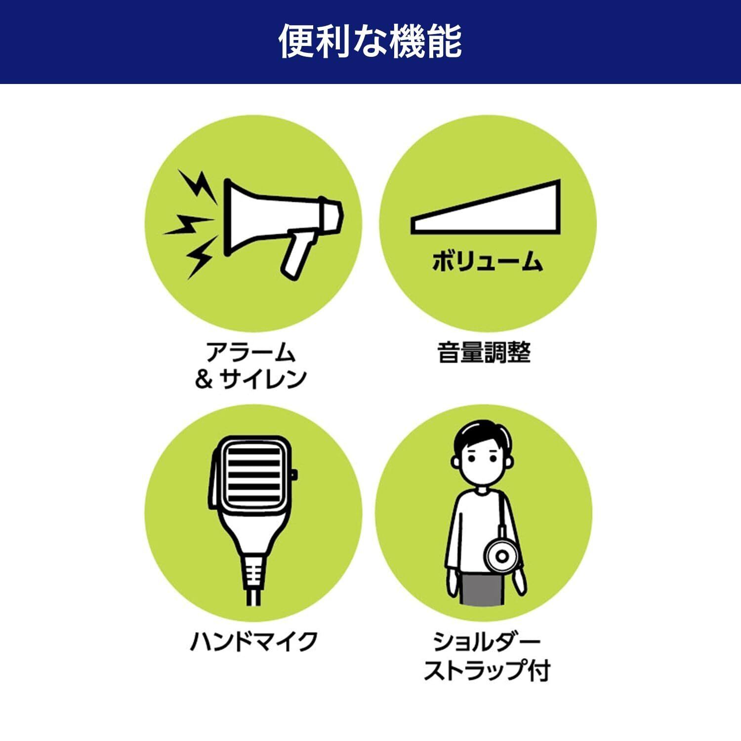 ■使用電池:単一形アルカリ乾電池×6本(別売) ■連続使用時間:約23時間(音量最大アラーム時) 約13時間(音量最大サイレン時) ※アルカリ乾電池使用時 ※電池の性能、使用条件により連続使用時間は短くなる場合があります。 ■出力:最大20W ■有効距離:約200m(音量最大アラーム、サイレン時) ※アルカリ乾電池使用時 ※周囲、使用の状況により有効距離は短くなることがあります。 ■音量:105dB/m(音量最大アラーム、サイレン時) ※アルカリ乾電池使用時 ■マイクロホン:コンデンサーマイクロホン ■外径寸法(約):幅325×高さ225×奥行195(mm)(最大値) ■質量:約680g(ショルダーストラップ含む、ハンドマイク、電池除く) ■付属品:ショルダーストラップ、ハンドマイク