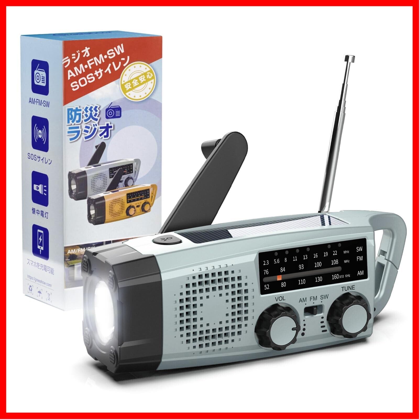 Greeshow 防災ラジオ 多機能 懐中電灯 SW/AM/FM 携帯ラジオ(FM周波数76.00Mhz - 108MHz) SOSアラート付き 台風 地震 津波 停電などの緊急対策 小型 2000mAhバッテリ 防水 防災用 アウトドア キャンプ 緊急用 USB充電式 非常用 ソーラー 手回し充電 スマホ充電可能 LEDライト PSE技術適合 日本語取扱説明書 GS-383