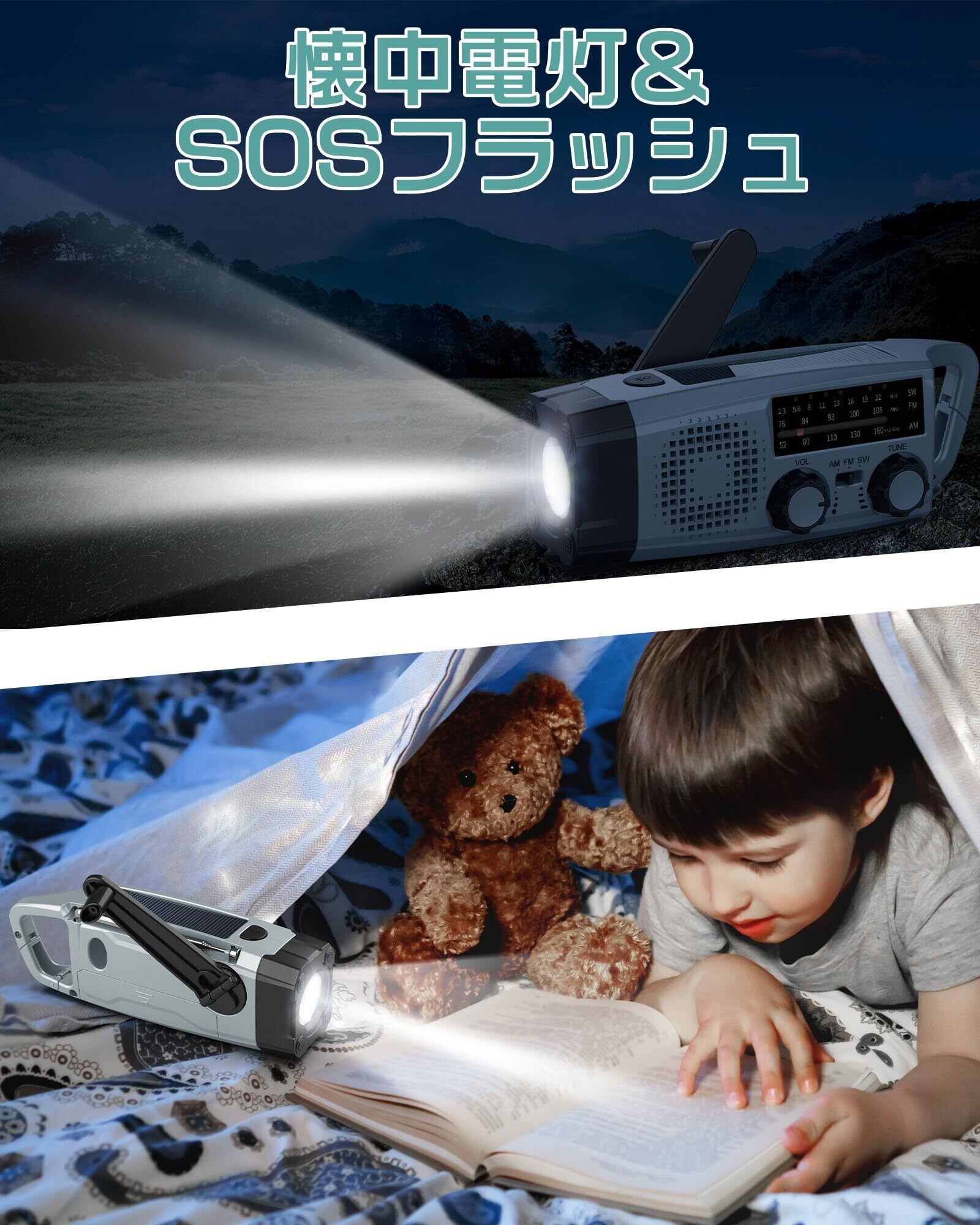 【多機能防災ラジオ&懐中電灯機能&SOSサイレン】LEDライトを搭載し、夜間や停電時に便利です。読書灯としても使えるため、普段使いにも適しています。非常時には大音量の「SOSサイレン」機能で周囲に危険を知らせ、安全を確保します。懐中電灯付きで停電時にも安心です。緊急用として一つ常備しておくことをおすすめします。"ŏ" ボタンを短く押すとライトモードが切り替わり、長押しでSOSサイレンが作動します。