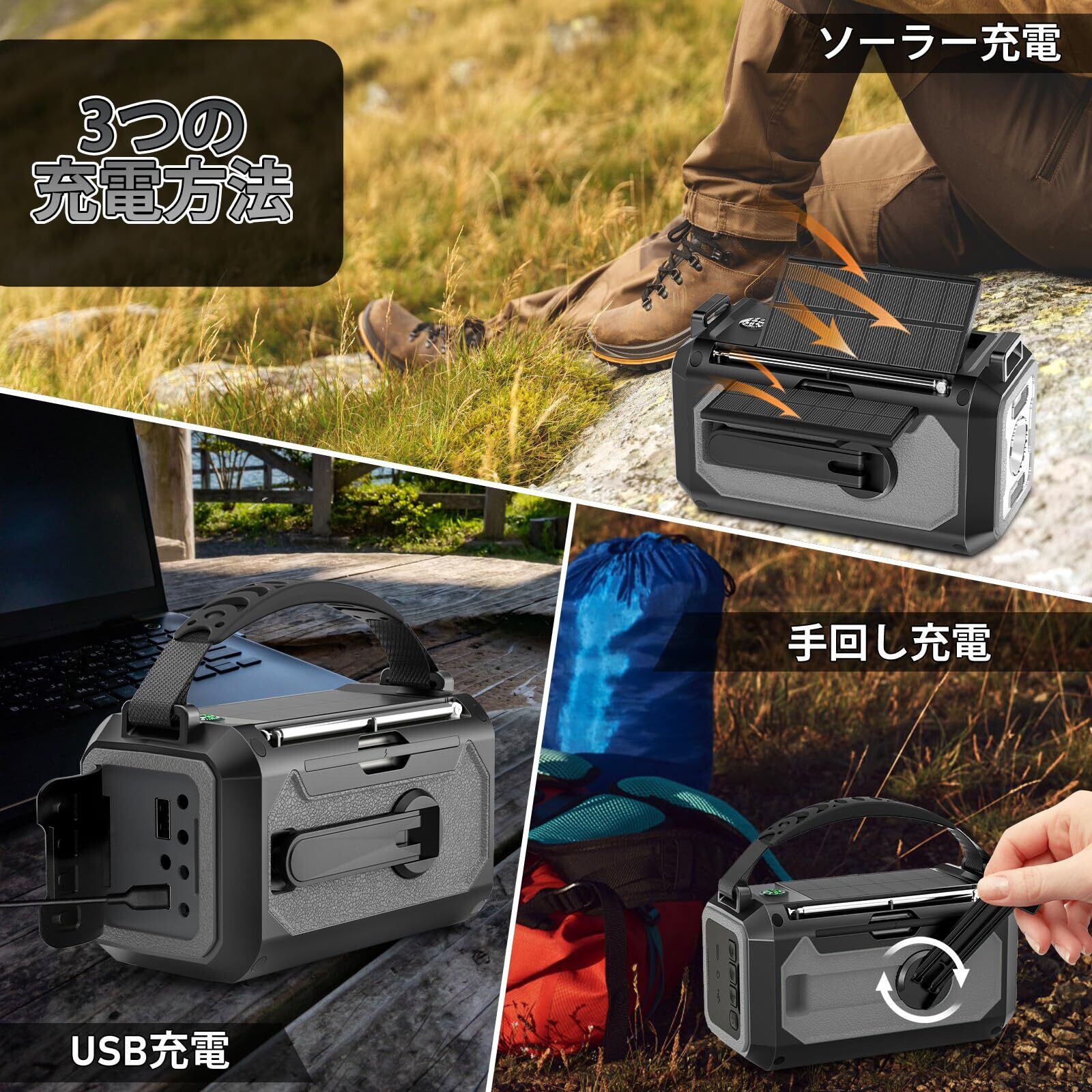【3つの充電モードで、いつでもどこでも充電可能】 このラジオは、USB充電、ソーラー充電、手回し充電の3つの充電モードに対応しており、停電時や災害時など、あらゆる状況で充電が可能です。効率的なソーラーパネルを搭載しているので、太陽光があれば充電できます。太陽光が得られない状況では、手回し充電でバッテリーを充電できます。