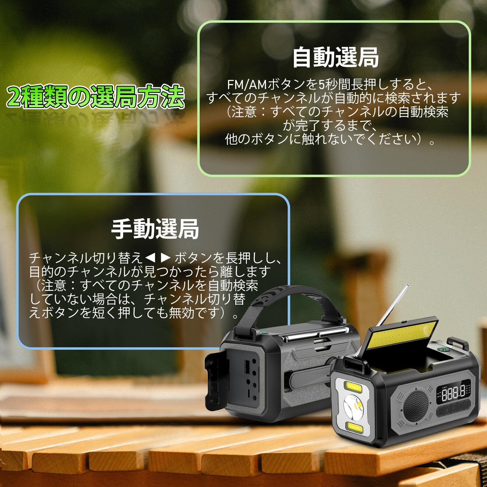 【12000mAhの大容量バッテリー搭載で、安心の電源供給】 このラジオは、12,000mAhの大容量バッテリーを搭載しており、緊急時には携帯電話や小型タブレットなどのデバイスに電源を供給することができます。停電時や災害時でも、大切なデバイスの充電を確保し、安心を提供します。