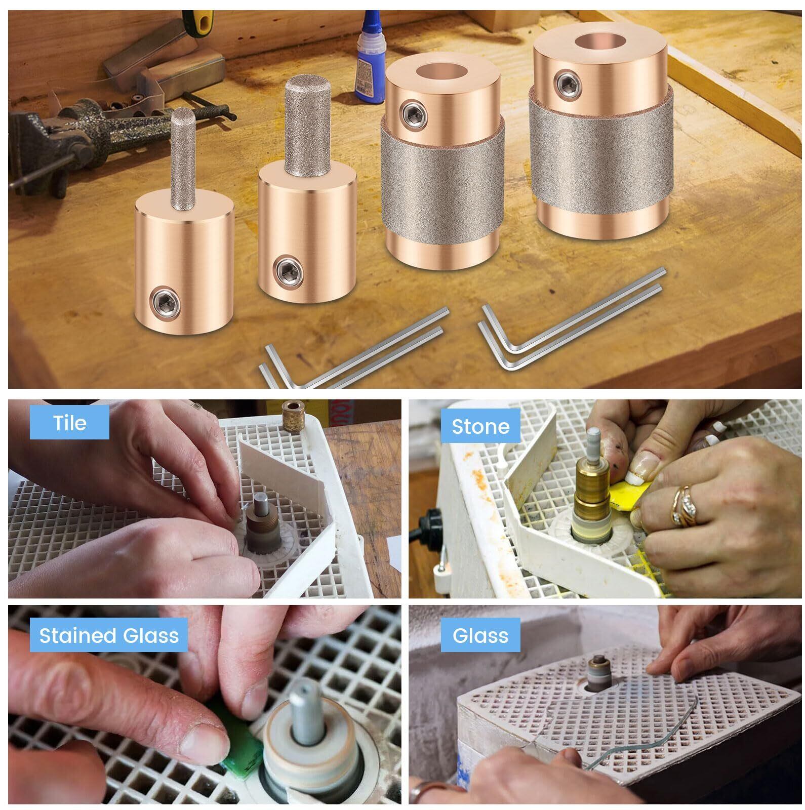 Pevcwa 4PCSステンドグラスグラインダービットダイヤモンドグラインダービットヘッドツールセット1インチ3/4インチ1/4インチ1/8インチマルチサイズブラスコアダイヤモンドグラインドホイールタイルガラス石用のレンチ(銅)