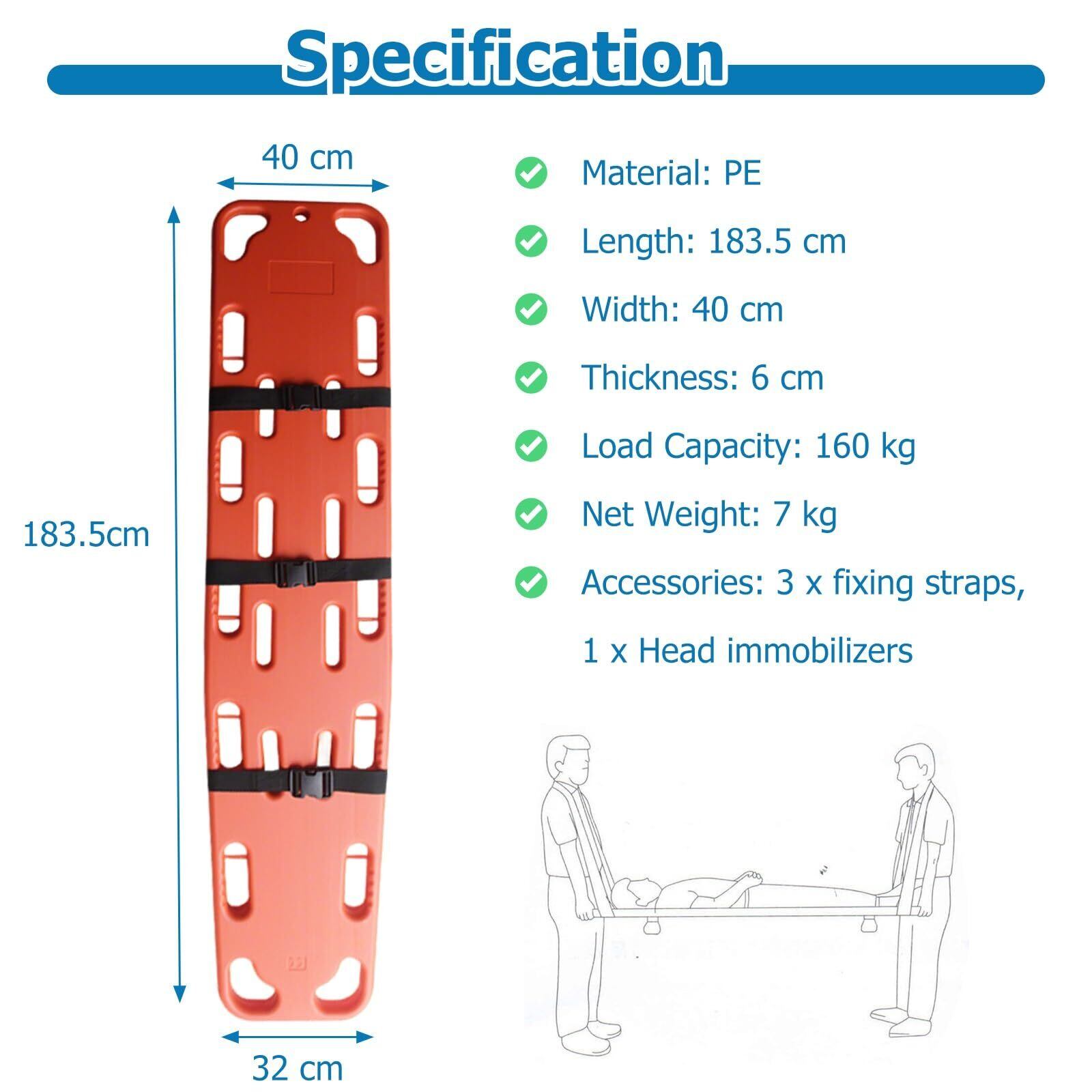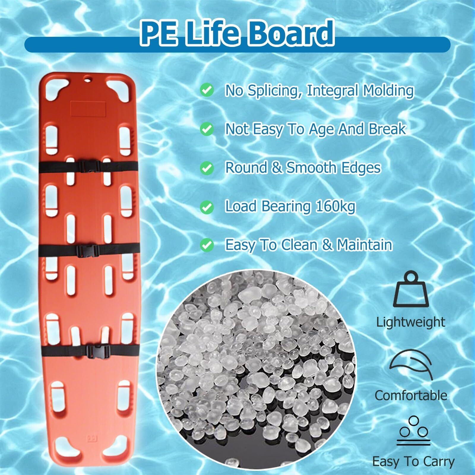 PE製ストレッチャーボード:PE素材で作られており、軽量で持ち運びやすく、浮力も強く、清掃やメンテナンスも簡単で、長期使用にも適しています。160kgの耐荷重があり、あらゆるタイプの患者のニーズに対応します。