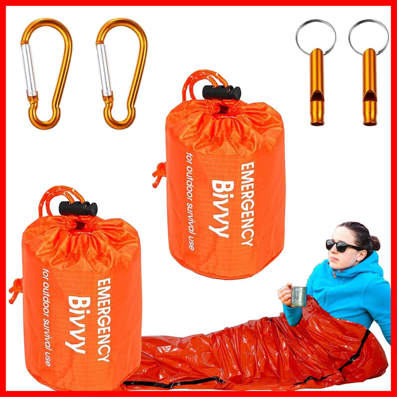 パッケージには、サバイバル寝袋2個、信号ホイッスル2個、金属カラビナ2個、ナイロンバッグが含まれます。