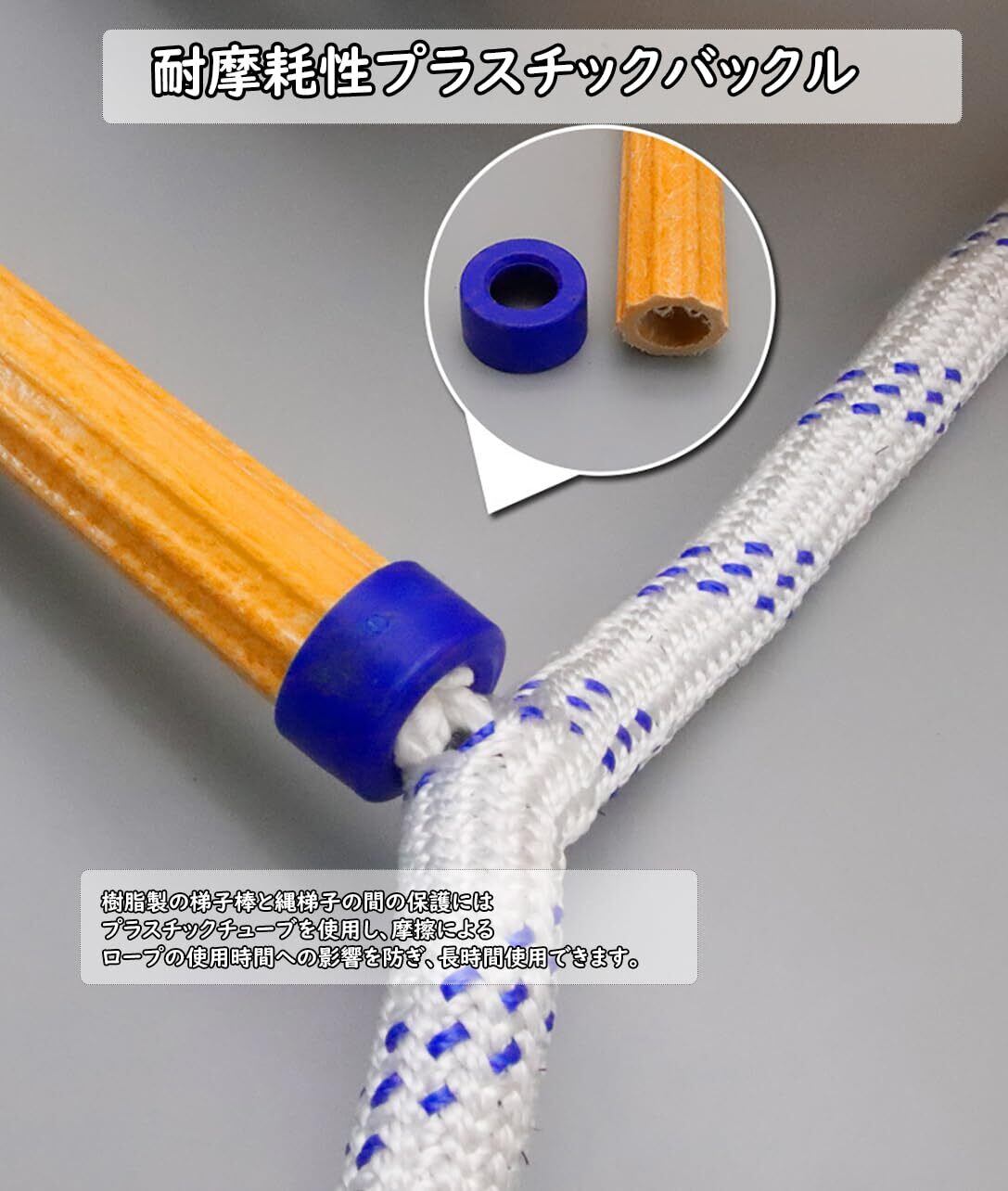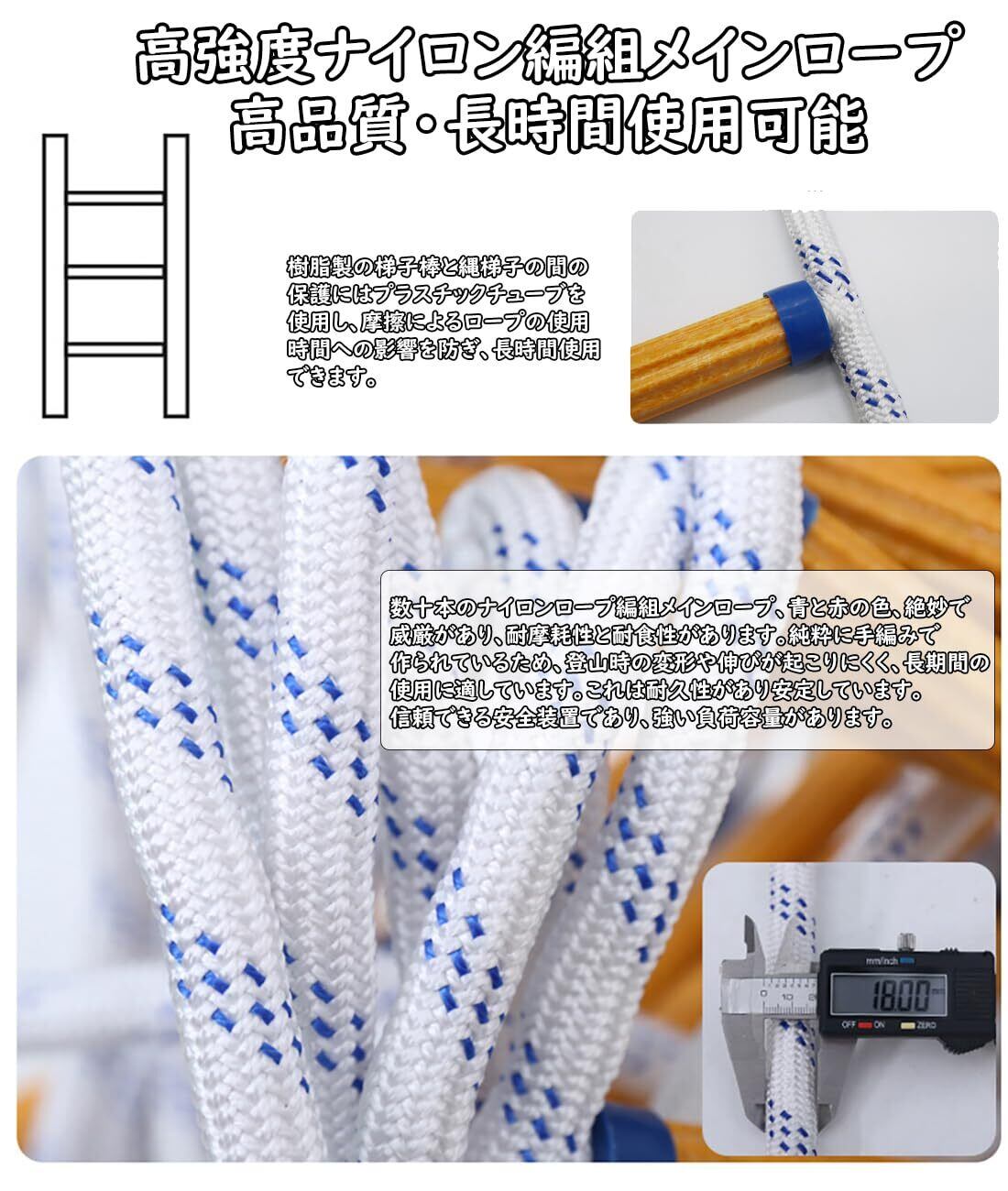 【厳選された素材、丈夫で耐久性】厳選されたナイロン素材、機械的に厚く編まれた織り方、丈夫で耐久性があり、耐摩耗性と耐腐食性に優れ、長期間ご使用いただけます。樹脂製のラダースティックは、滑りにくく変形しにくく、湿気で変形しにくく、柔軟性に富み、強くて丈夫です。登るときに変形したり伸びたりしにくく、耐荷重性に優れ、使用効果が優れています。