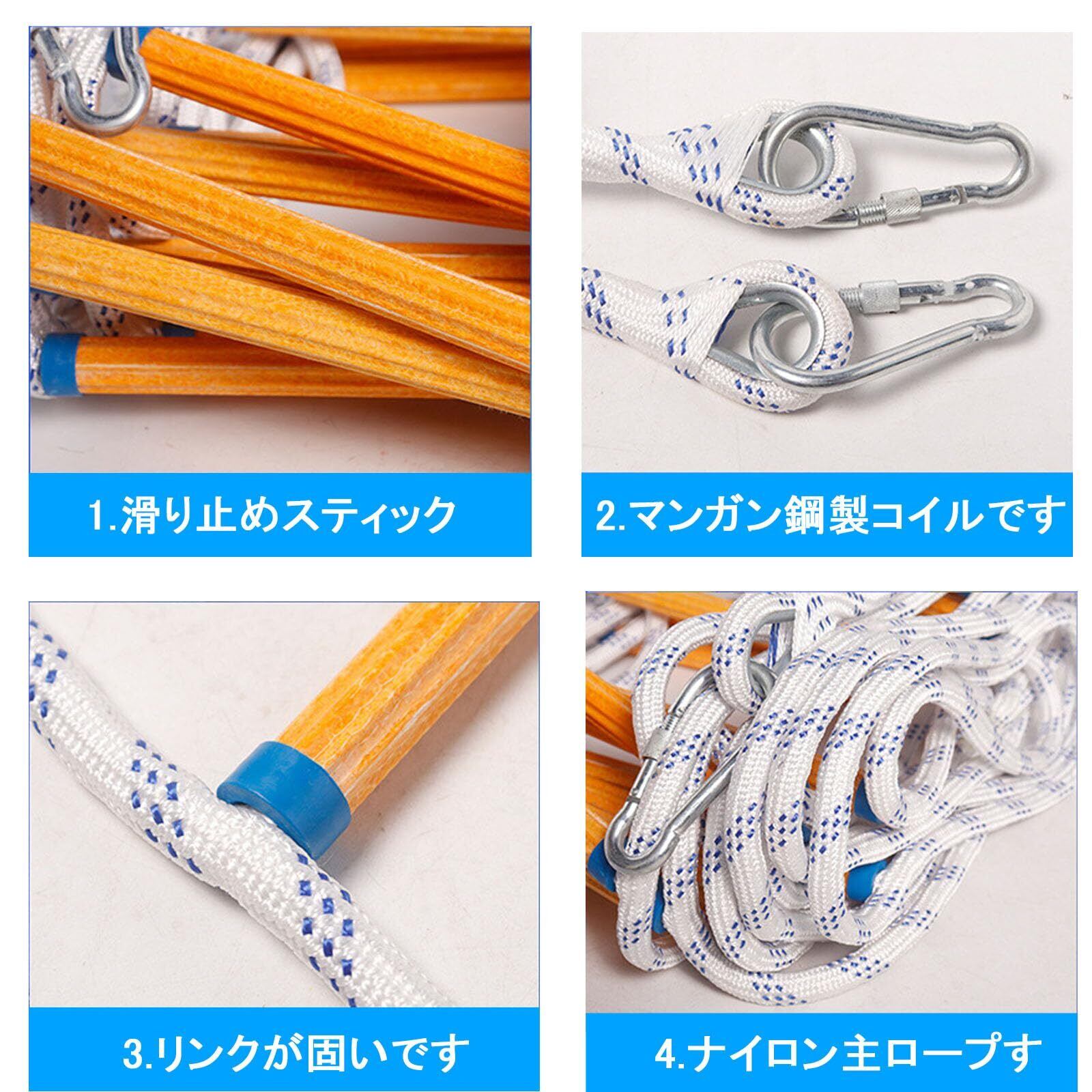 【優れた素材、滑り止め踏み棒】 はしごの足踏み部分は荷重に優れたエポキシ樹脂を使用しています。原生木のはしご棒の両側にワックスオイルを塗布して木の脱水後の乾き割れを防止し、一定の寿命延長作用がある。原生木材、丈夫で長持ち。耐衝撃性に優れ、表面の滑り止めパターンは足元をより安定させます。軟梯編頭はマンガン鋼で作られたフックリングを採用し、フックとロープ梯子の直接接触による摩擦を防止する