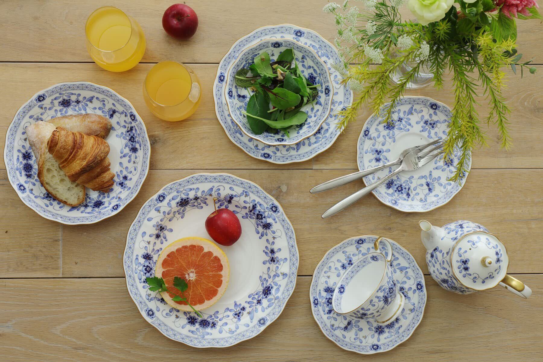縁起の良い花として古くから親しまれてきた梅の花を、藍色の濃淡で表現した「ミラノ」は気品と豪華さを兼ね備えた日本の洋食器の定番商品です。