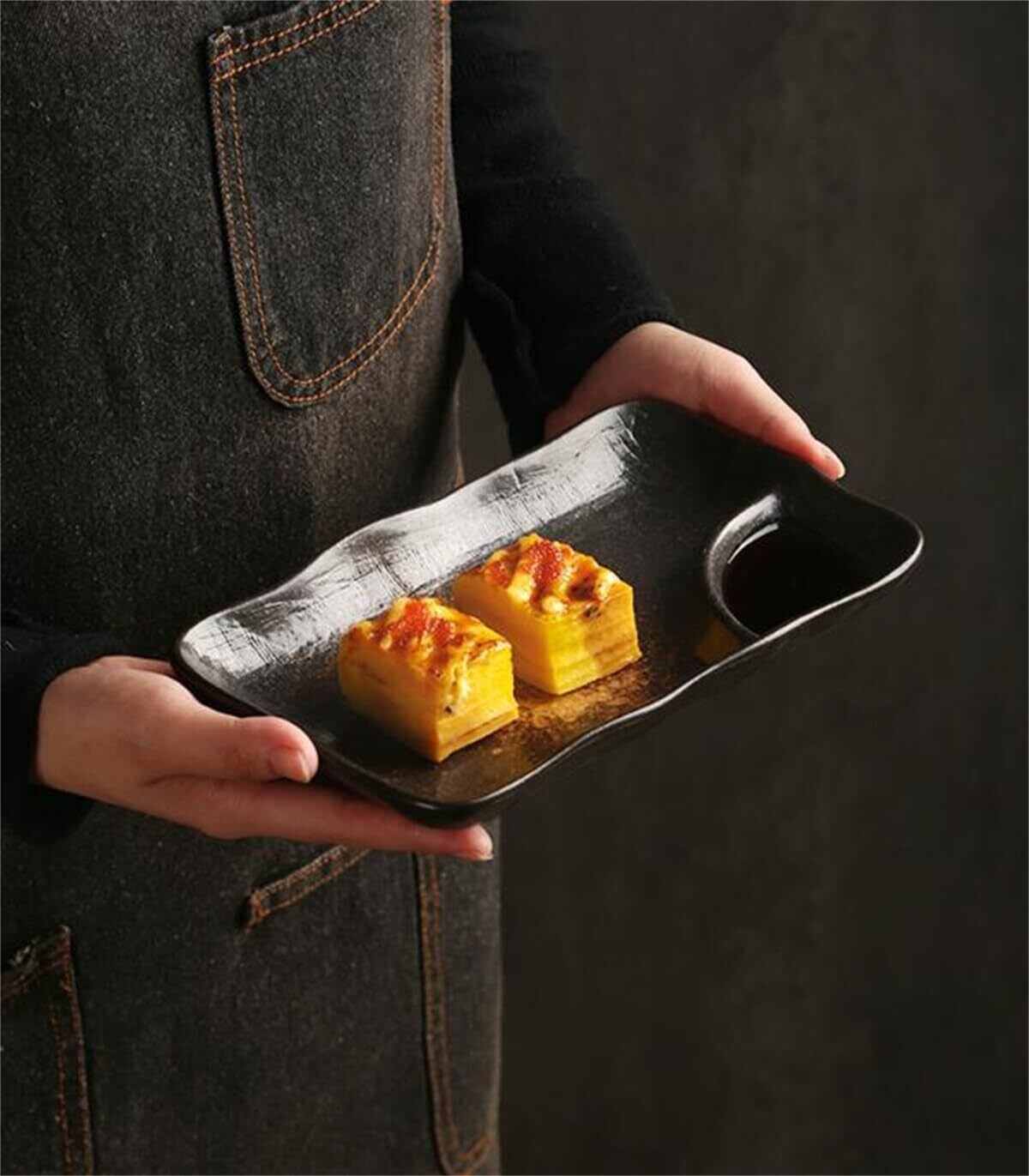 人間工学に基づいて作られたこの長角皿は、奥行きが細めにデザインし、傾けてもこぼれないようになってます。