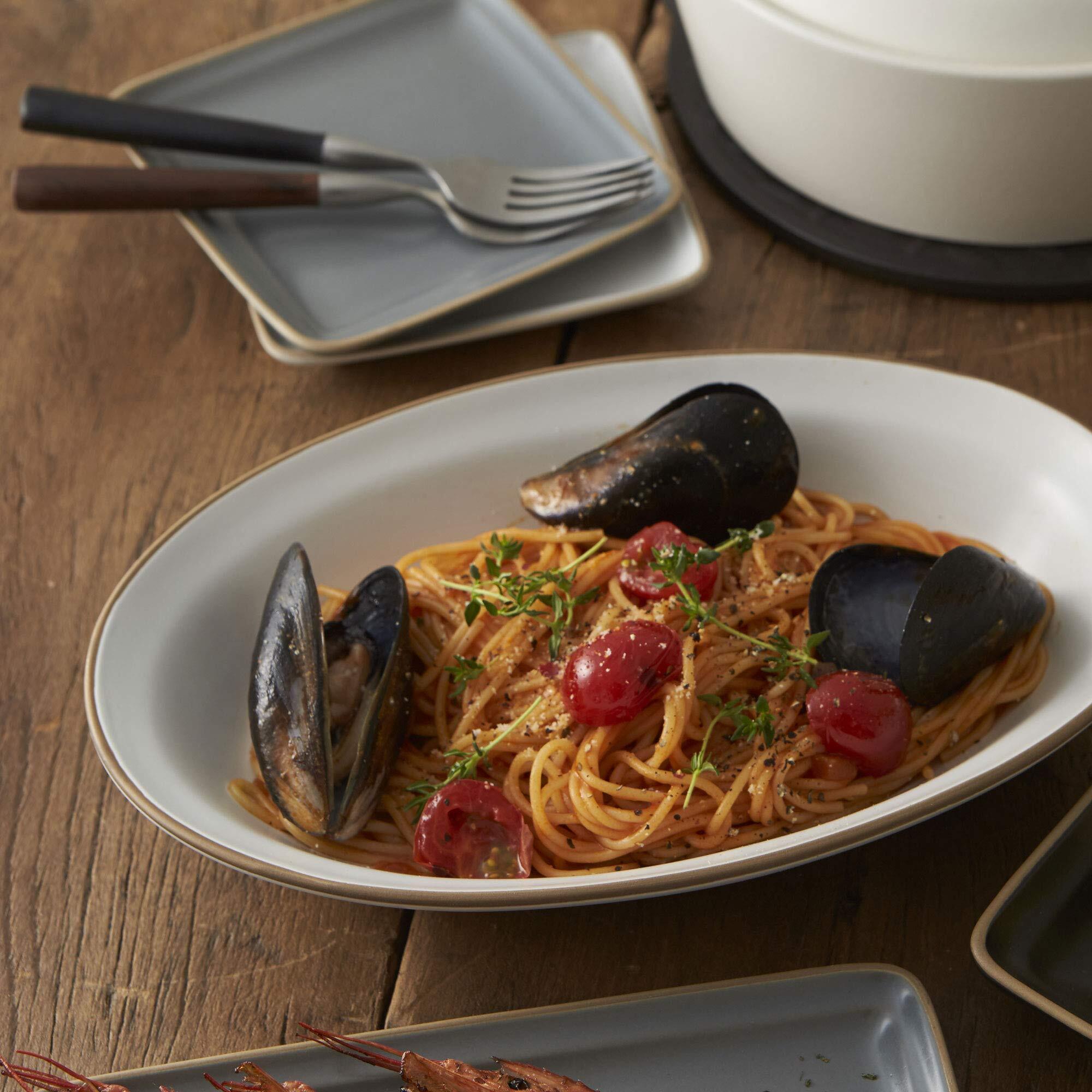 エッジラインシリーズにスクエアタイプが加わりました。何気なく料理を盛りつけても、洗練された印象にまとまりやすいのがスクエアタイプの強み。ラウンドライプと組み合わせてワンランク上のコーディネートを楽しんで。