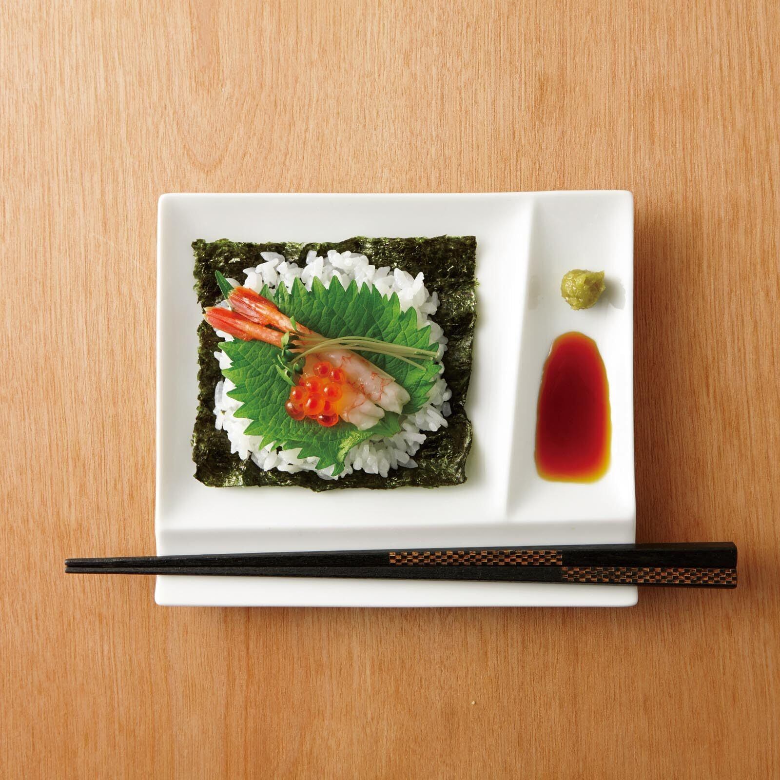 箸置き、取り皿として、または市販の海苔を4等分すればちょうど収まり良く置けるので、手巻き寿司を家庭で楽しめます。