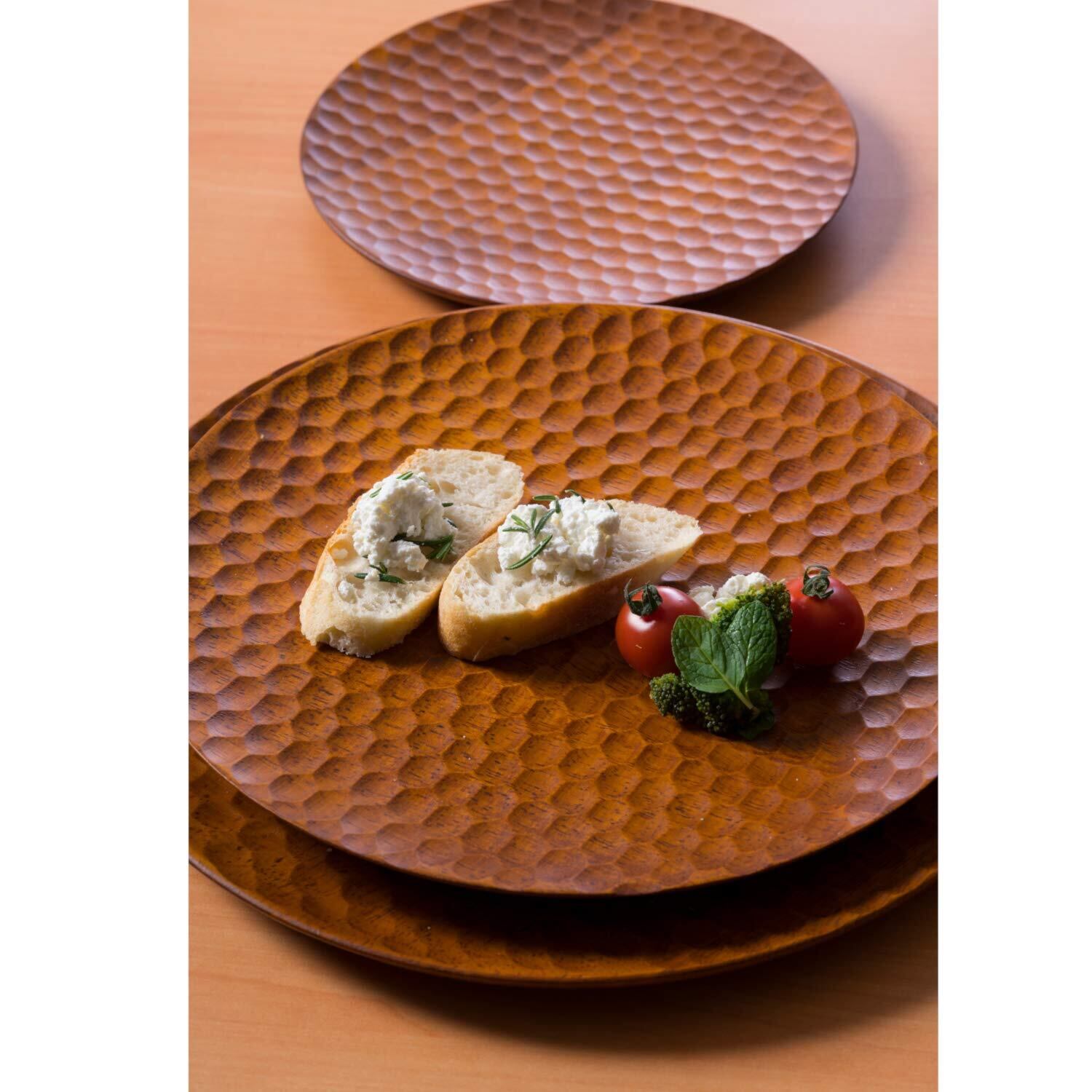職人が丁寧に彫り上げた表面が特徴的なプレートです。パスタオイルやサラダのドレッシングが適度に油切りできます。