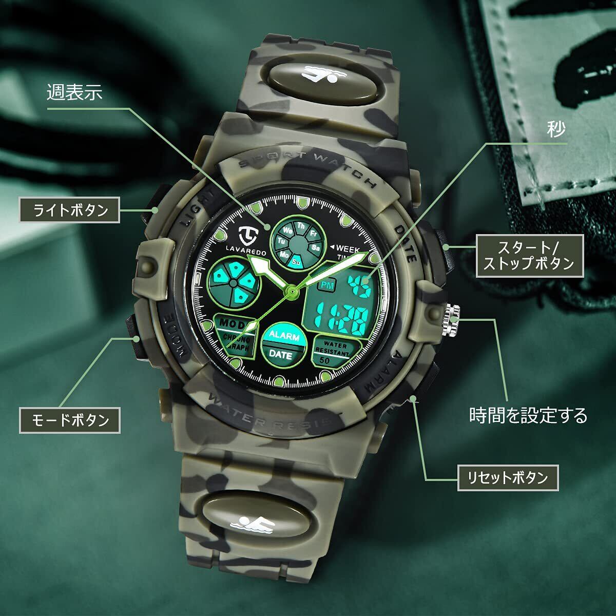 子供腕時計 ボーイズ スポーツウォッチ アウトドア多機能防水 アラート 日付曜日表示 デュアルタイム LED アナログ表示 女の子男の子 デジタルウォッチ (迷彩グリーン)