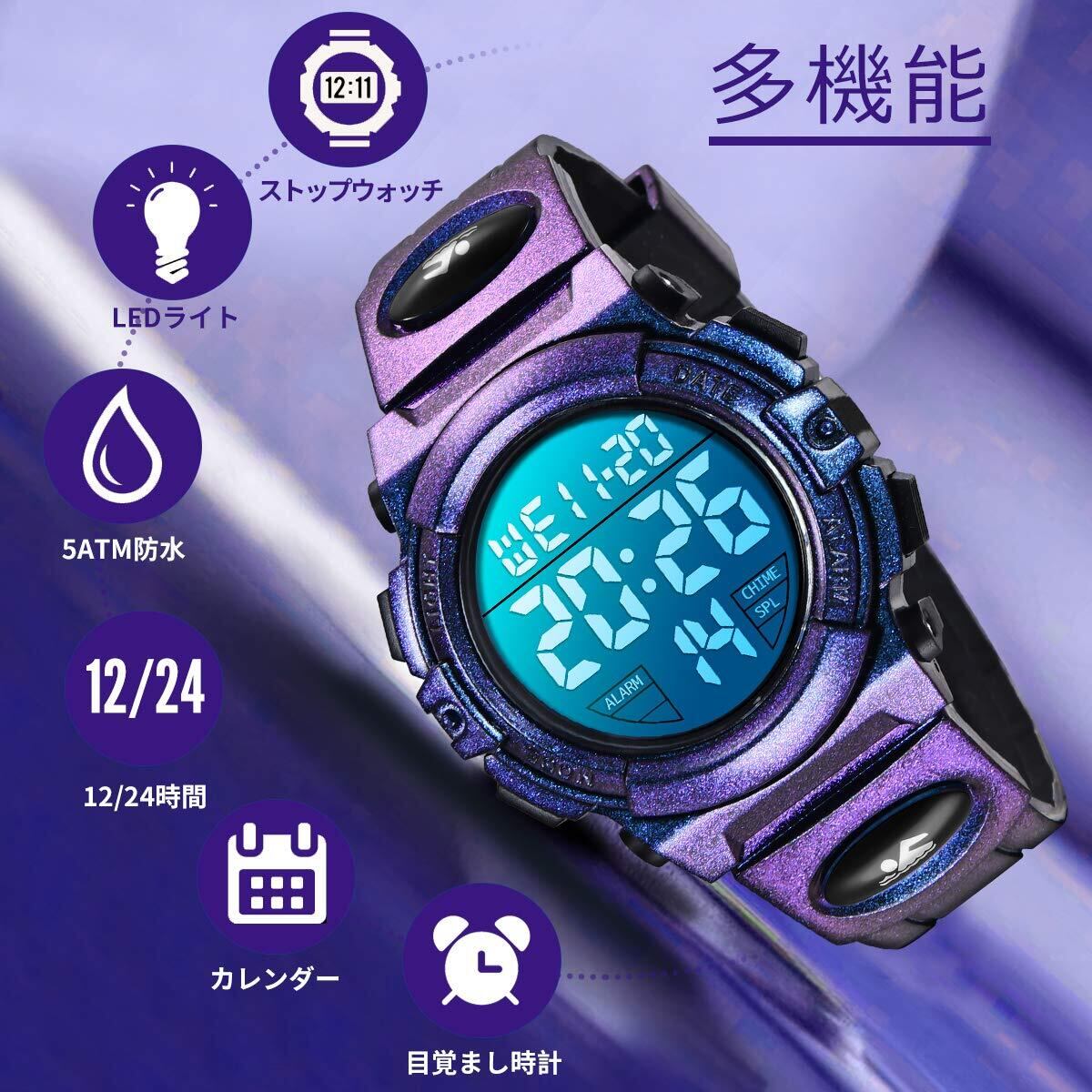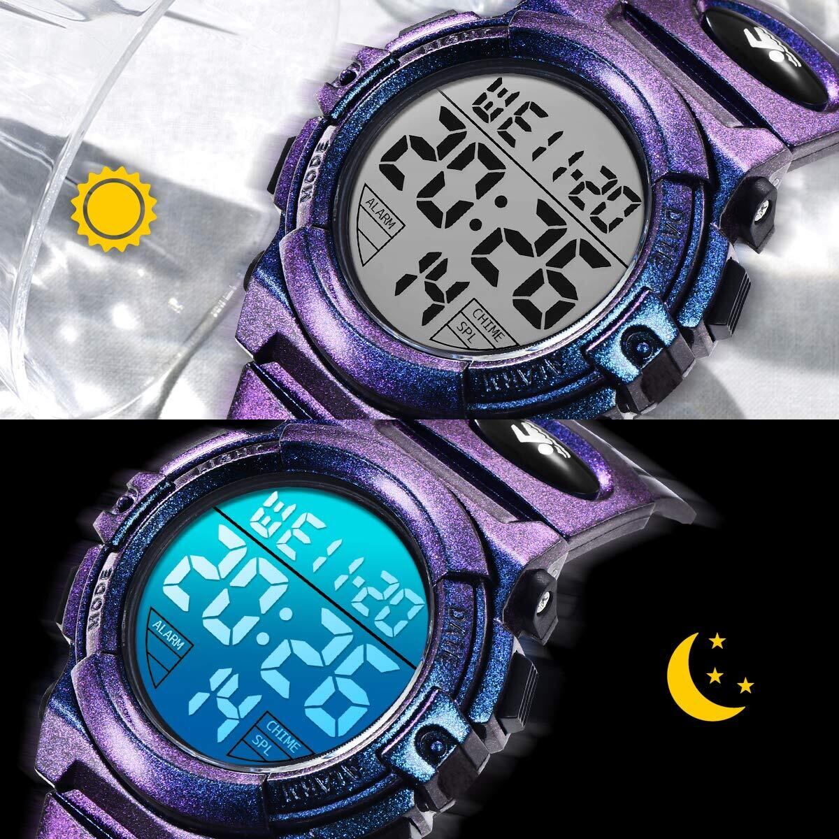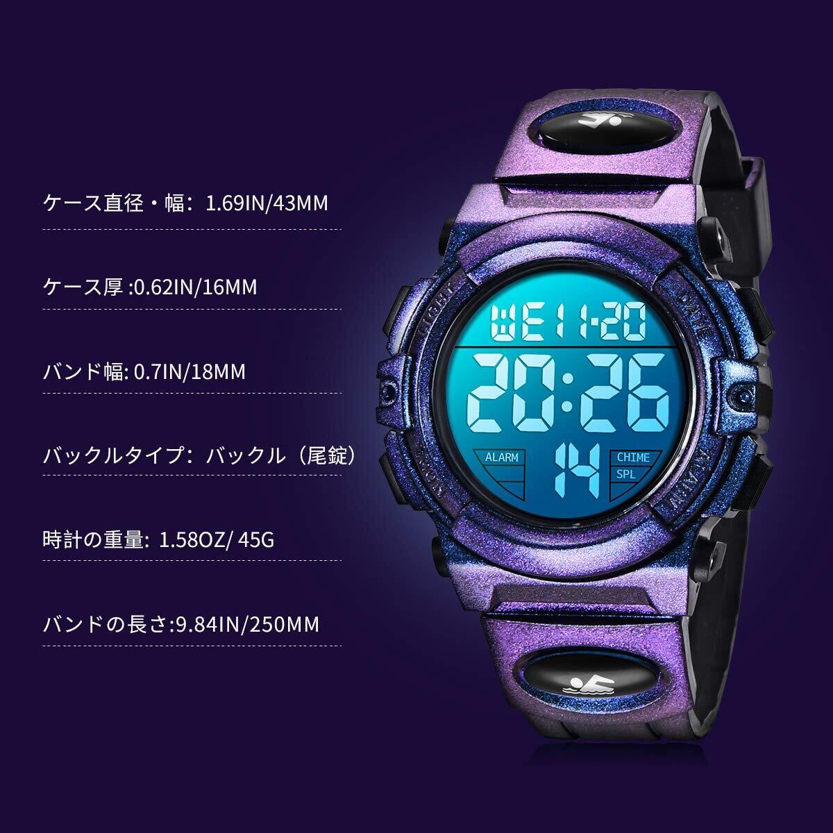 子供腕時計 ボーイズスポーツウォッチ アウトドア多機能防水 アラート 日付曜日表示 デュアルタイム LED アナログ表示 女の子男の子 デジタルウォッチ (パープル)
