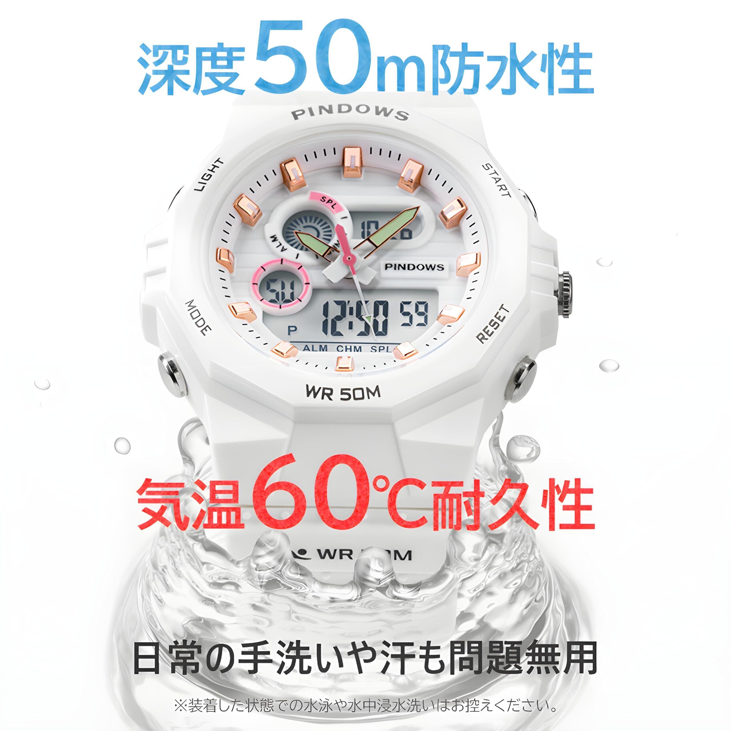 【高耐久性】 子供向けに簡単に壊れることがないよう「頑丈さ」にこだわって作りました。・50m防水・60℃耐熱性・高硬度樹脂ガラス・衝撃吸収ポリウレタン製ベルト&ボディ
