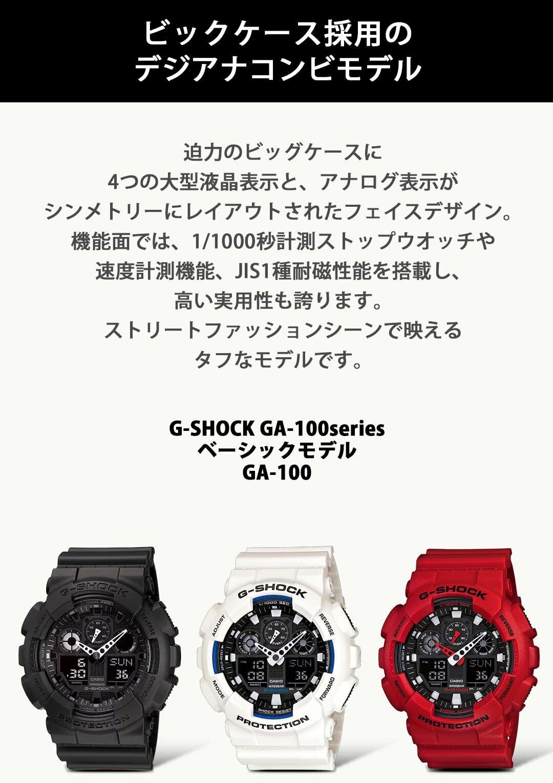 ワイドフェイスが好評のアナログとデジタルのコンビネーションモデル、GA-100からNewカラーが登場。マット仕上げのケースとバンドには、G-SHOCKのブランドカラーであるブラック×レッドとシンプルなホワイト×ブラックの2色を採用。文字板には4つの液晶窓とスピードインジケーターをシンメトリーにレイアウトし、すっきりとしたフェイスデザインに仕上げた。また、1/1000秒計測ストップウオッチや速度計測機能、JIS1種耐磁性能を搭載し、高い実用性も誇ります。ストリートファッションシーンで映えるタフなNewモデル。