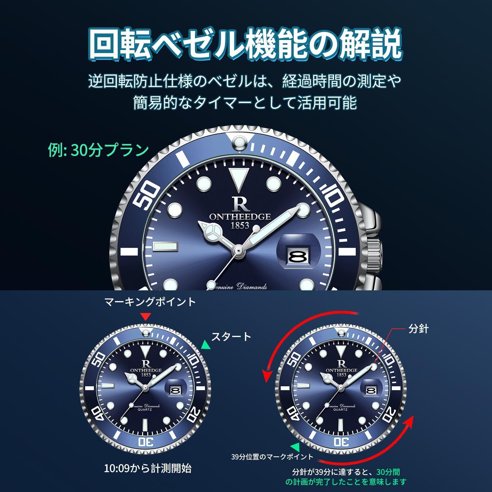 【新春セール】腕時計 メンズ watch for men アナログ クオーツ うて時計 安い 3気圧日常生活防水 ステンレス 回転ベゼル 日付 蓄光 人気 おしゃれ ビジネス シンプル かっこいい 文字盤の大きい サブマリーナ 男性 紳士 就活 記念日 誕生日 (ブルー) | Cherry Blossoms