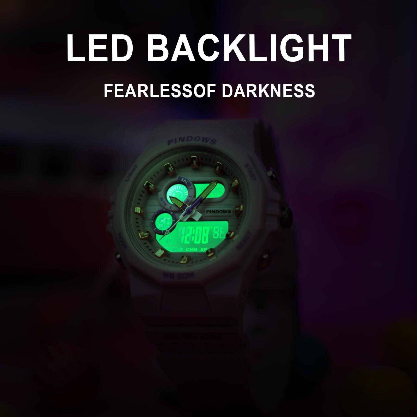 PINDOWS女性用腕時計、50M防水仕様、アウトドア向けデジタルスポーツウォッチ、多機能、LEDバックライト、カレンダー、アラーム付き腕時計、ストップウォッチ