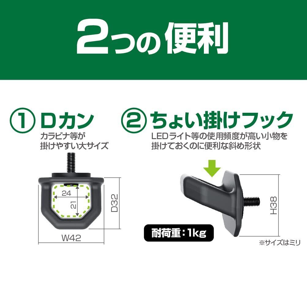 斜めフック形状は、LEDライトのストラップやビニール袋などのちょい掛けに重宝します。