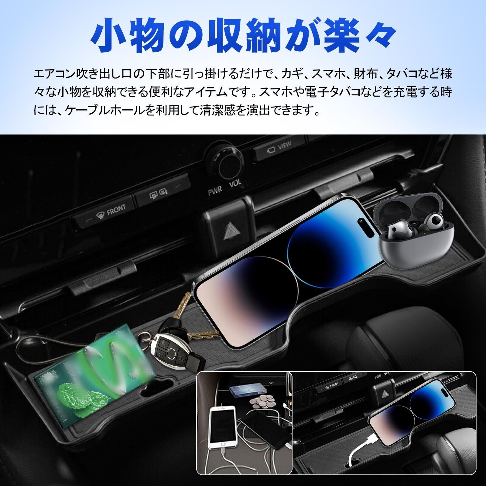 【小物の収納が楽々】エアコン吹き出し口の下部に引っ掛けるだけで、カギ、スマホ、財布、タバコなど様々な小物を収納できる便利なアイテムです。スマホや電子タバコなどを充電する時には、ケーブルホールを利用して清潔感を演出できます。