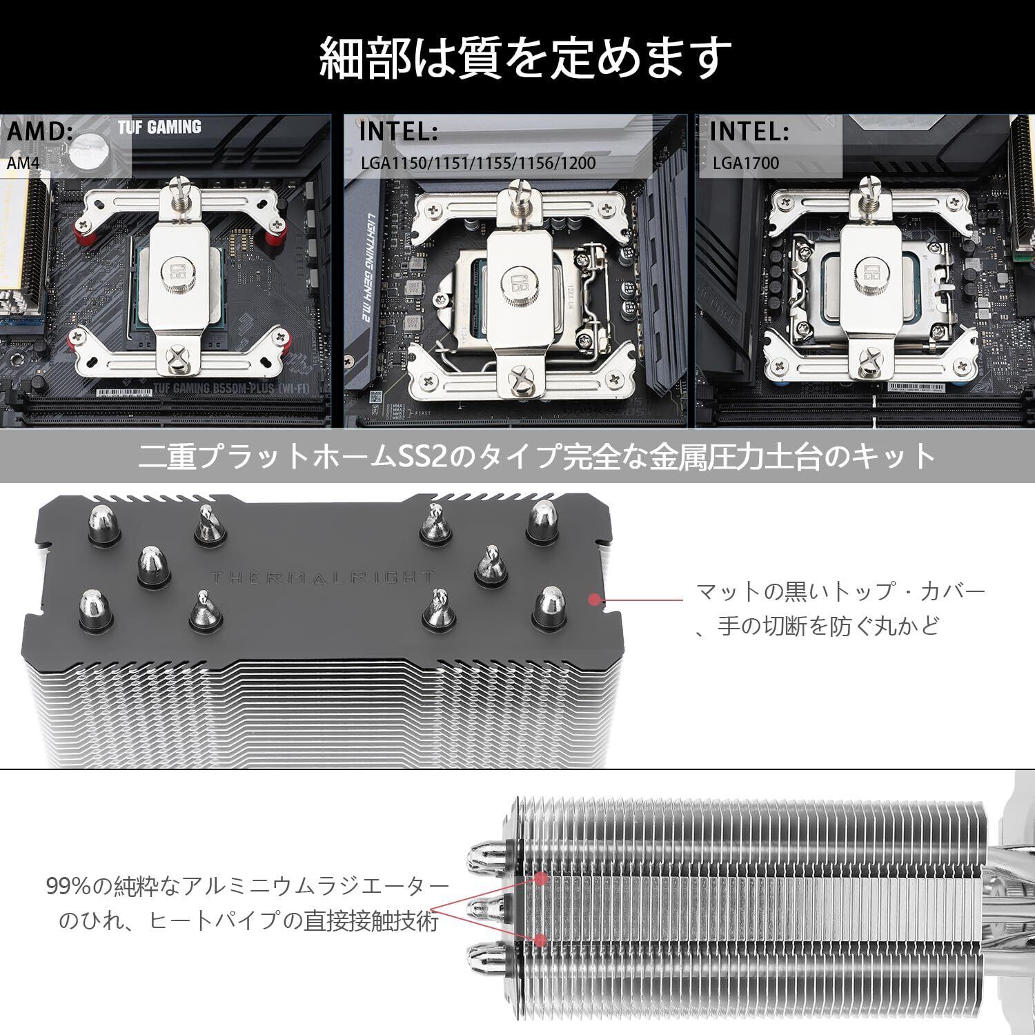 【互換性】CPUヒートシンクソケットサポート:Intel:1150/1151/1155/1156/1200/1700/1851,AMD:AM4/AM5;異なるCPUソケットプラットフォームに対して、相応の取付板或いはファスナーを提供する。