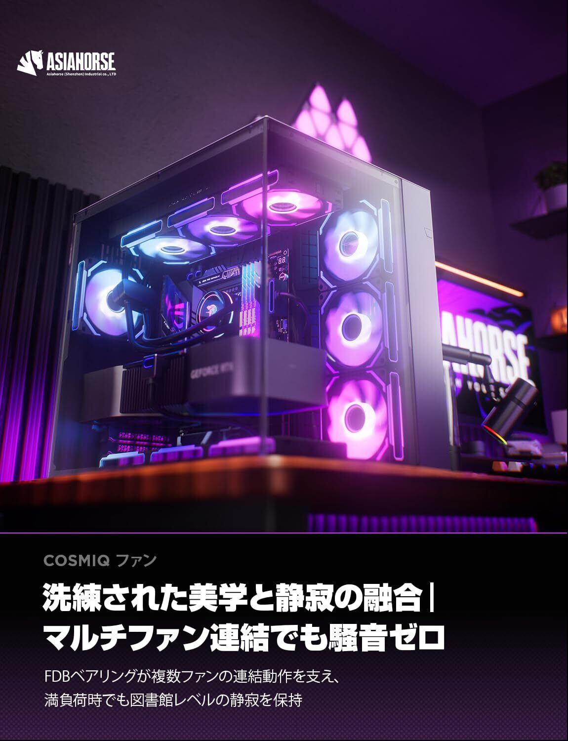 [仕様]: モデル:COSMIQ。数量:3本。サイズ:120*120*2.5。逆向(吸気)。デイジーチェーンファン。回転数:800-2000 RPM/Min。ノイズ:6-30 dB(A)。風量:68.5 CFM 。風圧:2.15mmH₂O。ベアリングのタイプ:FDB軸承。寿命:80000時間以上。240/360mmのCPU水冷高さに対応。