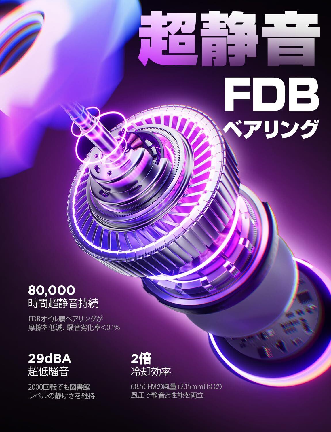 [超静音FDB軸承]: 性能と耐久性の革新的進化—精密流体動態ベアリング技術が2000回転時でも28dBAの極静音を実現。特殊オイル膜密封構造で金属摩擦を低減し、68.5CFMの風量と2.15mmH₂Oの風圧を確保。80000時間(約9年)の超寿命設計は、深夜作業中の日本のクリエイターやゲーマー向けに、高負荷時でも図書館並みの静寂環境を提供。