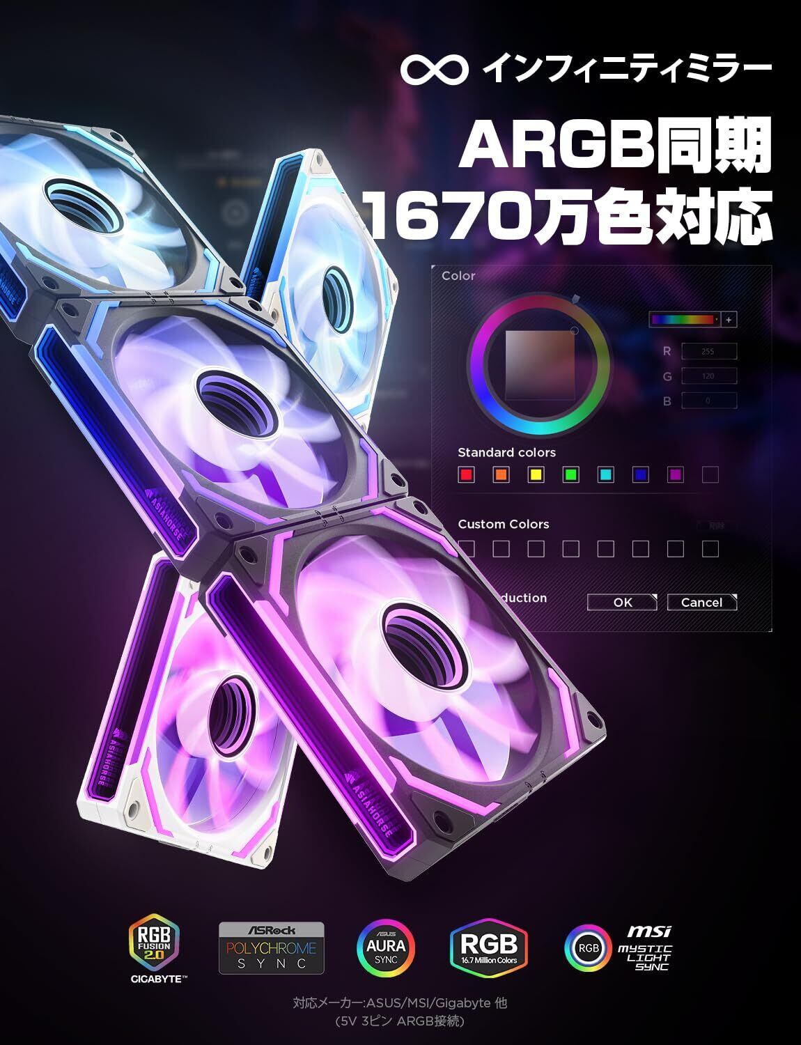 AsiaHorse COSMIQ ARGB PC ファン 120MM 3本 逆向(吸気) [連結式] [静音FDB軸受] RGB ケースファン 4Pin PWM 5V 3Pin ARGB 2000RPM/風量68.5CFM/高性能FDB軸受/作動時間80,000時間 Asus Aura ASRock MSI RGBとの互換性あり 黒