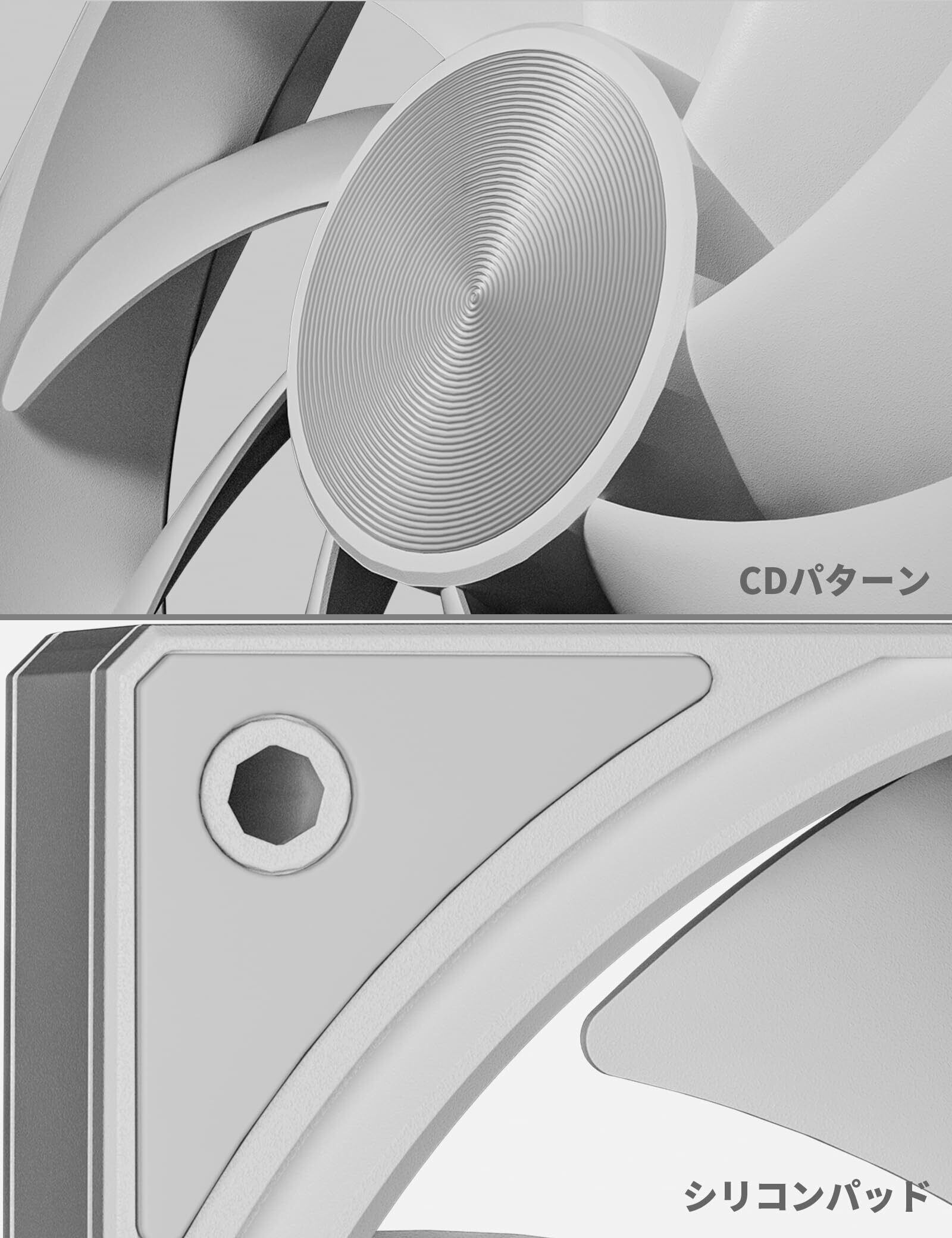 セット内容:冷却ファンx1、取付用ネジ × 4。ファンの真ん中は独特のCDパターン設計、見た目もシンプルでスタイリッシュ。4PINメスソケットはマザーボードに接続し、PWM制御信号を受信して、他のファンとのファン速度同期を実現します。