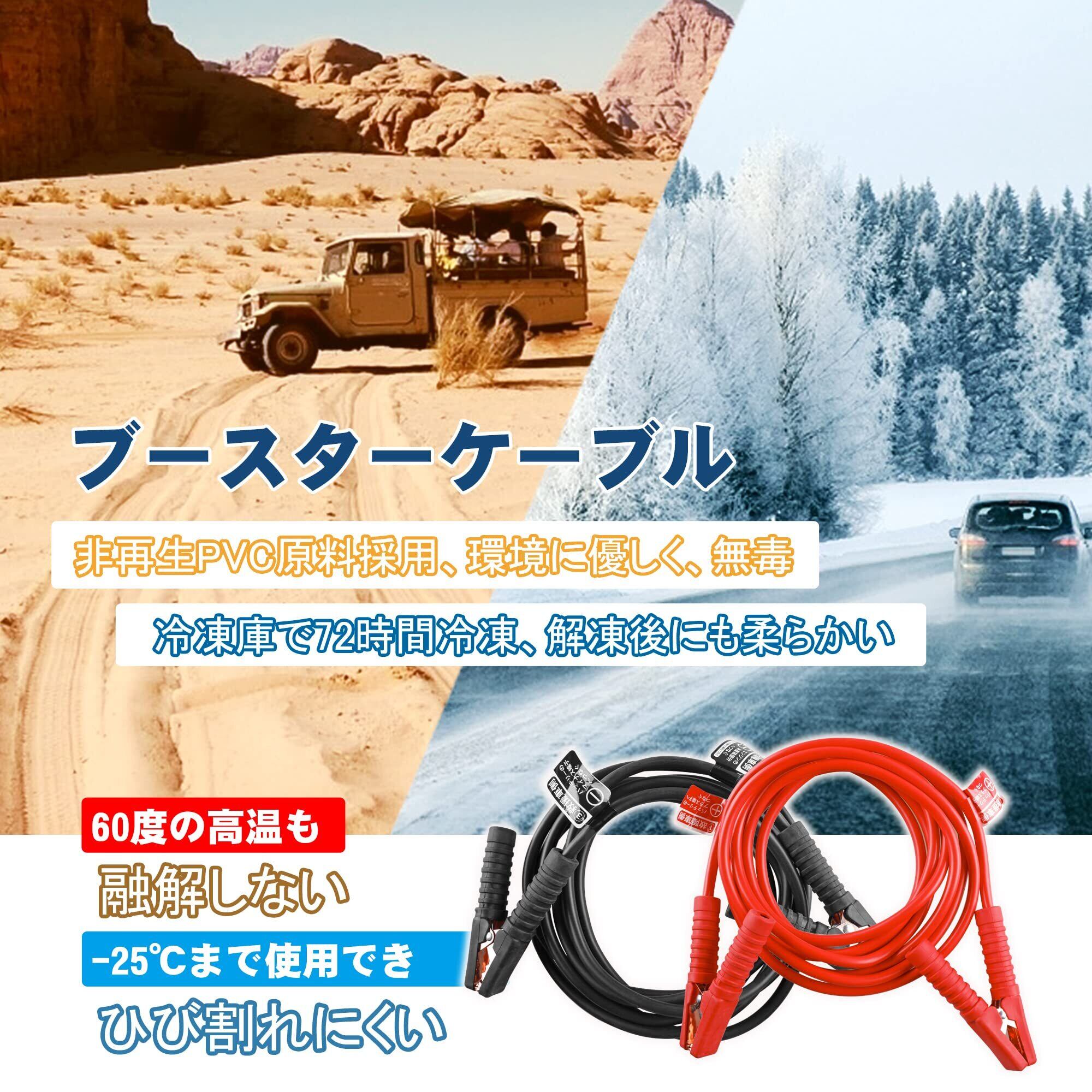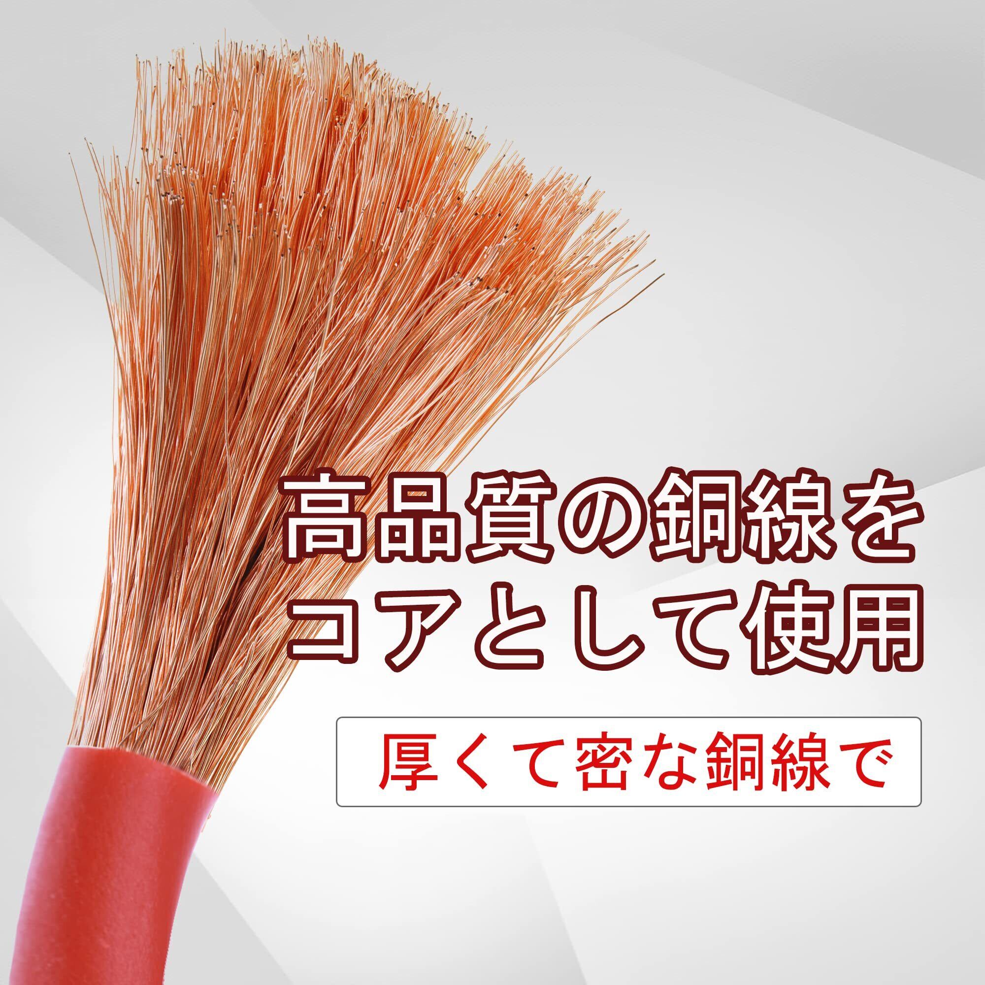 ●【芯線】CCA材質、Φ0.32mm*190本、最大容量120Aまでの電流が安定的に流れ、効率良く短時間で作業が済むのでお勧めです。電流量が120Aのブースターケーブルであれば、ほとんどの乗用車には対応できる