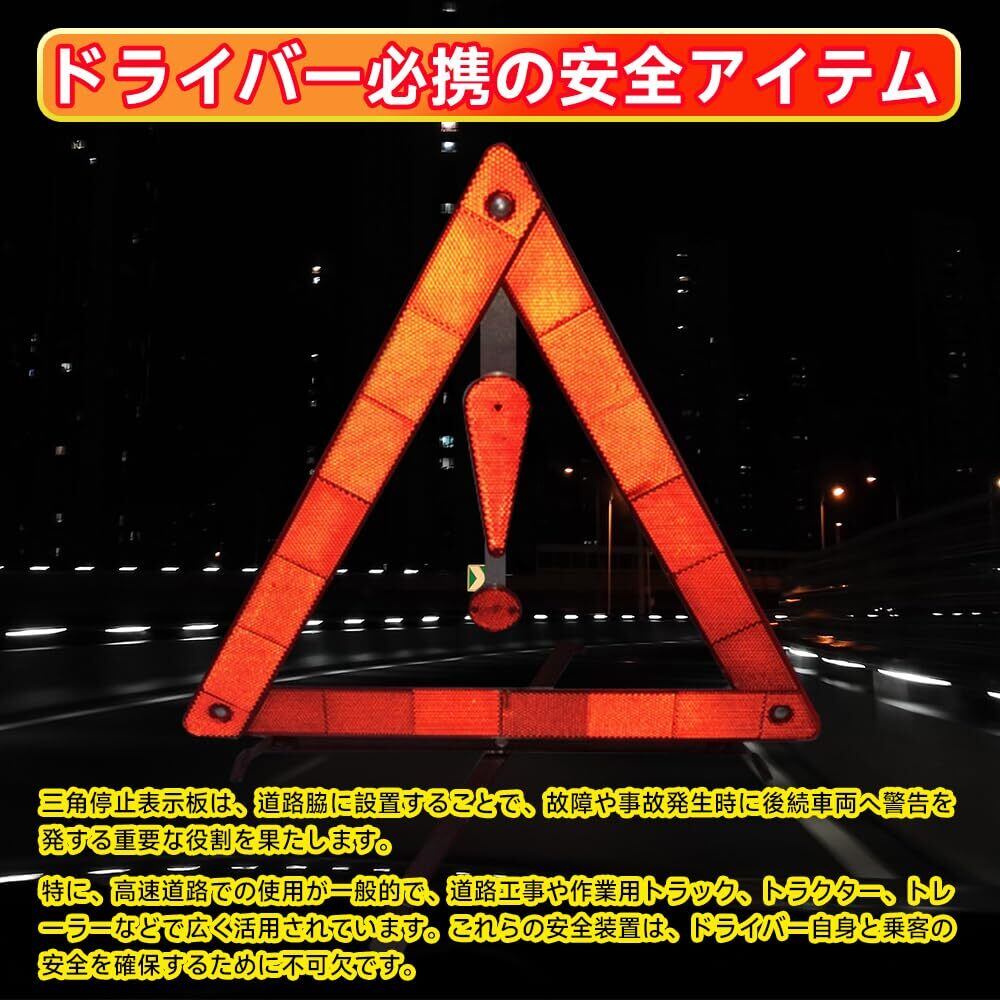 【商品仕様】商品サイズは40cm×40cm×30cm、重さは約368gです。三角表示板1個と専用の収納ケース1個が付属しており、昼夜を問わずご使用いただけます。 【昼夜間兼用型】高品質の反射素材を使用し、緊急停車や事故発生時に後続車両への警告として効果的です。昼夜を問わず使用可能で、事故の再発防止に役立ちます。 【コンパクトな収納設計】三角表示板の接合部には金属リベットを使用しており、耐久性に優れています。また、道路面と接する部分には滑り止め加工が施されているため、冬季でも安心して使用できます。折りたたみ式でコンパクトに収納可能なデザインで、トランクルームに収納しても場所を取らず、持ち運びにも便利です。 【優れた耐久性】高品質な素材を使用した警告三角形は、厳しいテストに合格し、強風や悪天候にも耐える設計です。接合部は金属リベットで固定されており、耐久性が高く、長期間の使用でも安心です。これらの特長により、風や悪天候の中でも安定して使用できます。 【ドライバー必携の安全アイテム】三角停止表示板は、道路脇に設置することで、故障や事故発生時に後続車両へ警告を発する重要な役割を果たします。特に、高速道路での使用が一般的で、道路工事や作業用トラック、トラクター、トレーラーなどで広く活用されています。これらの安全装置は、ドライバー自身と乗客の安全を確保するために不可欠です。